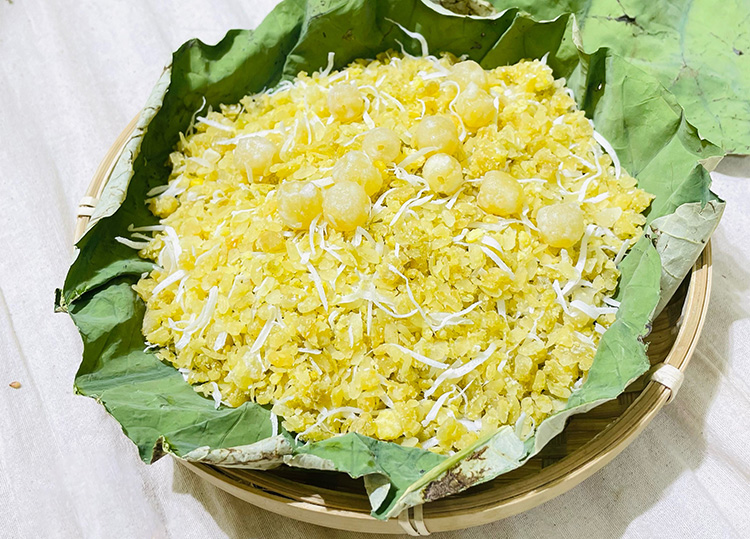 Xôi cơm được làm từ 3 nguyên liệu chính là đậu xanh, cốm non và dừa nạo. Món ăn này mang hương vị thơm ngon từ đất trời ngoài ra nó còn thể hiện, ý muốn quay quần bên nhau của gia đình trong ngày trung thu.