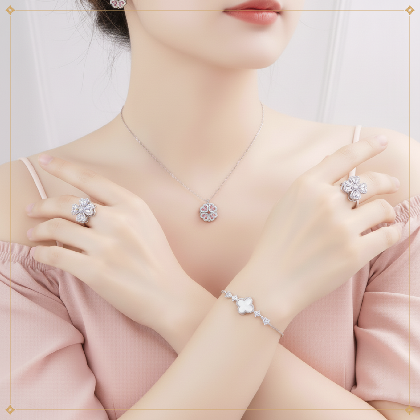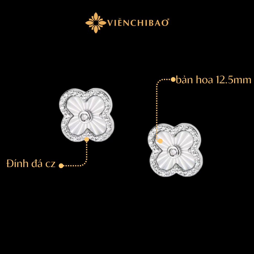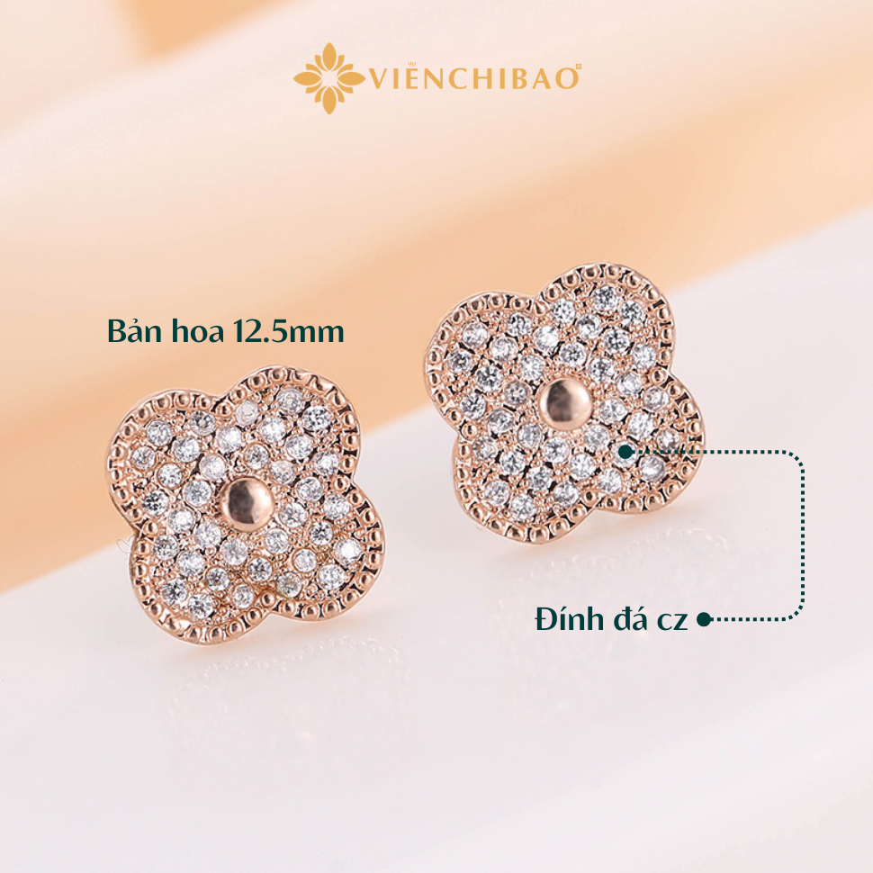 Bông tai cỏ 4 lá đính đá viền bi S925 – Viễn Chí Bảo