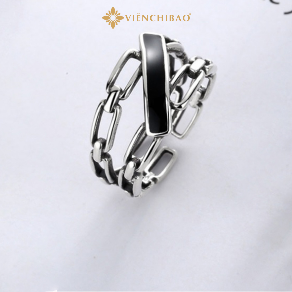 Nhẫn Nữ Bạc Thái Xích Đá Đen Chéo – Viễn Chí Bảo