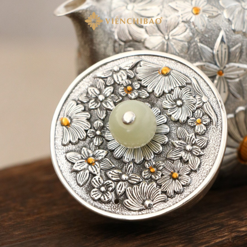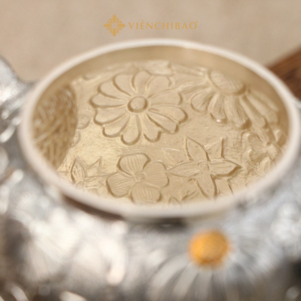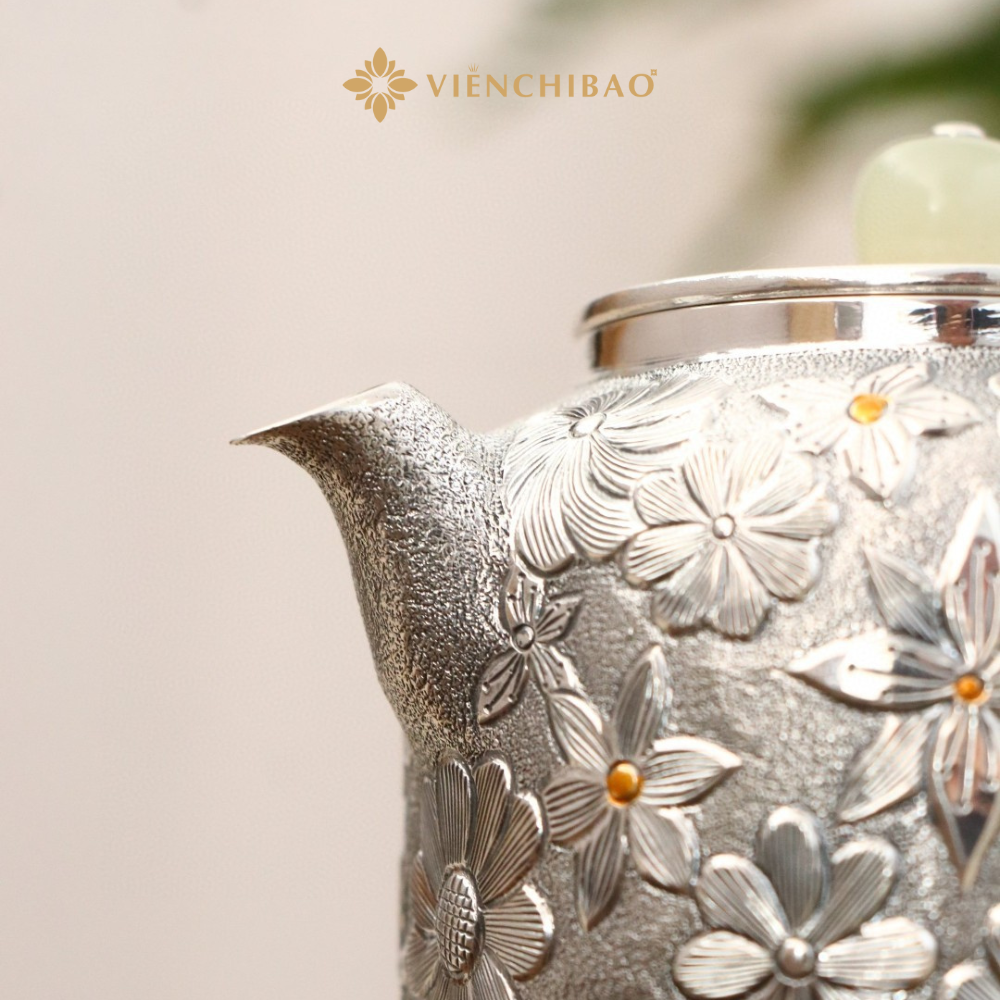 Ấm Trà Bạc S999 Họa Tiết Vạn Hoa Phù Điêu – Viễn Chí Bảo