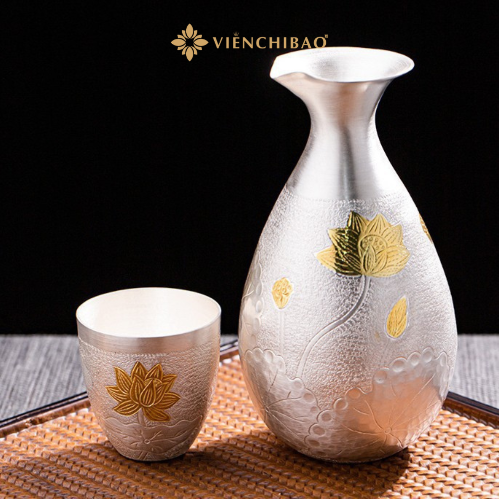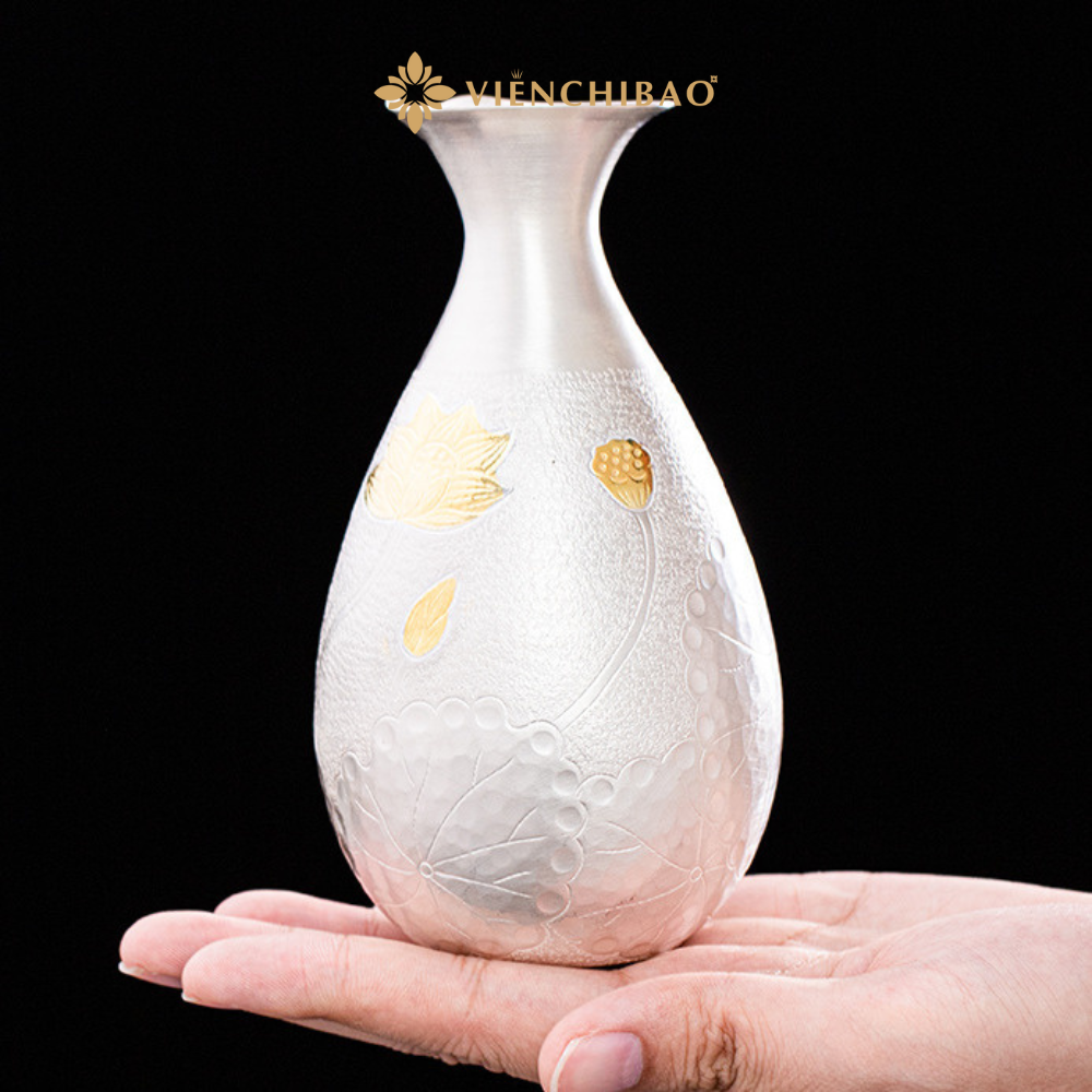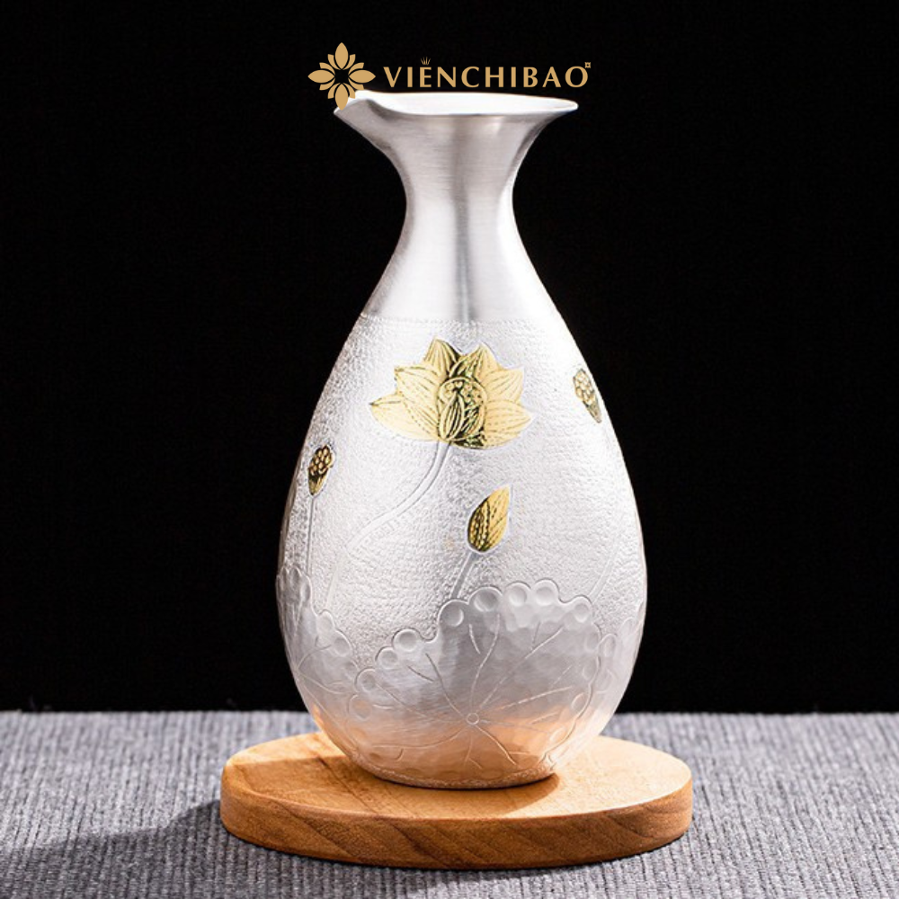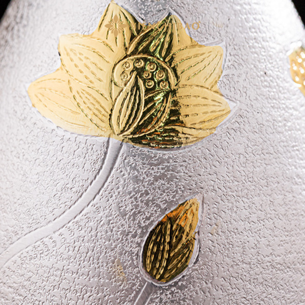 Bình đựng được tạo hình mềm mại, thân phình nhẹ và cổ thắt gọn, giúp việc rót chất lỏng được mượt, hạn chế chảy giọt. Bề mặt bạc được xử lý bằng kỹ thuật búa thủ công tạo texture sần đặc trưng, phản chiếu ánh sáng đẹp mắt. Họa tiết hoa sen được chạm khắc sâu nét, xen kẽ mạ vàng nổi bật, tạo điểm nhấn cao cấp và mang đậm tinh thần Á Đông.