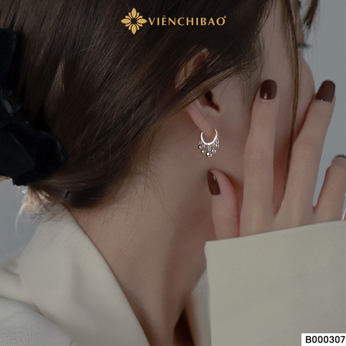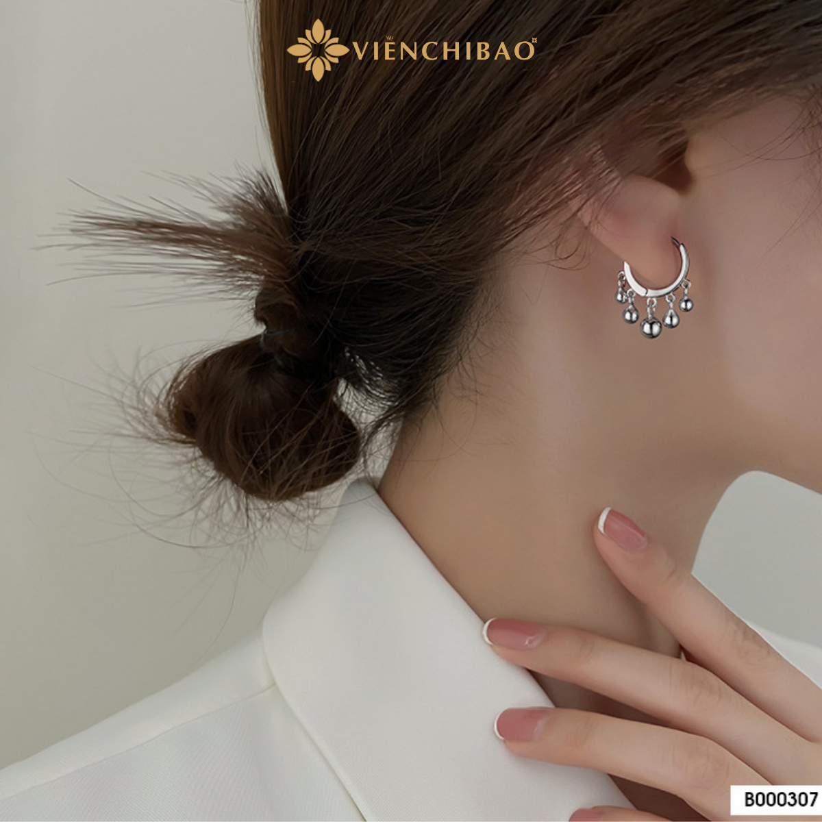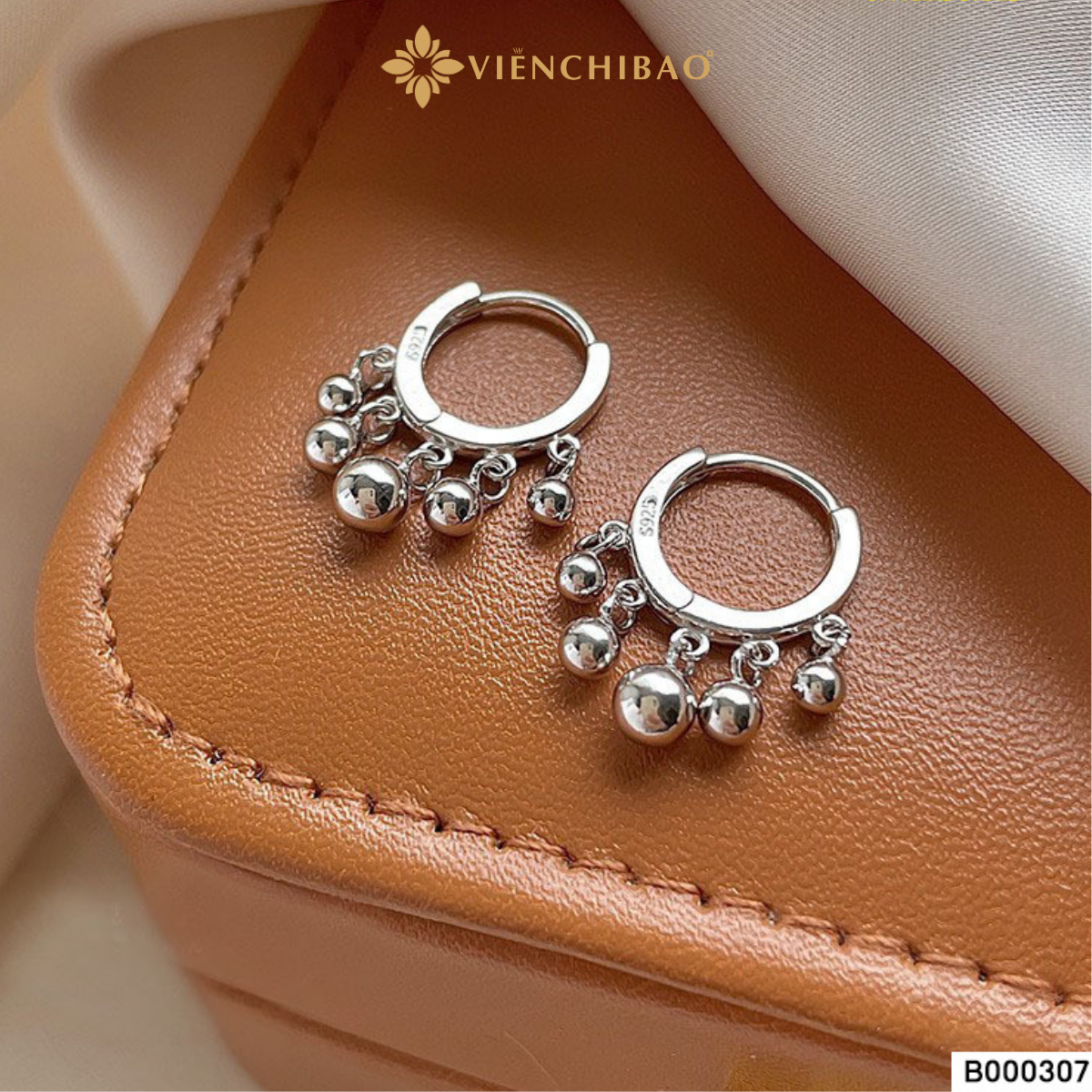 Bông tai dạng vòng tròn nhỏ, với hạt bi bạc được treo tua xuống tạo thành một thiết kế đẹp mắt và duyên dáng.