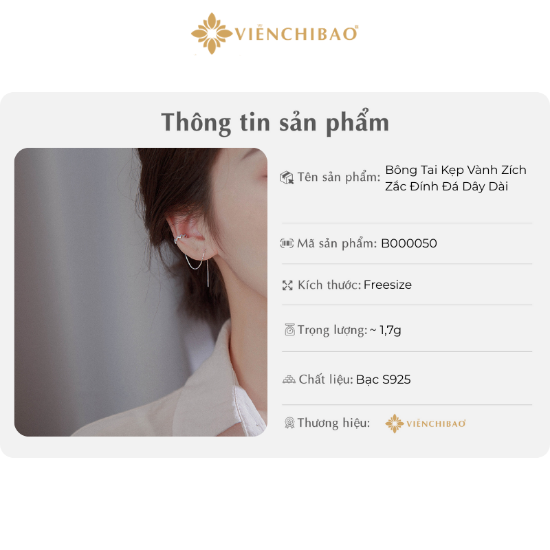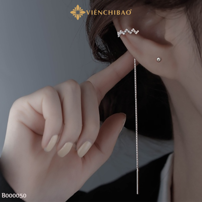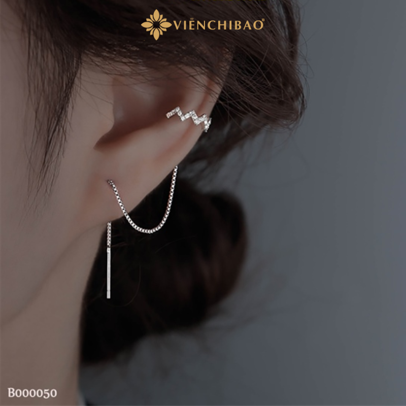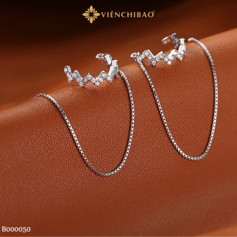 Viễn Chí Bảo tự hào mang đến sản phẩm trang sức bạc cao cấp, trong đó có bông tai kẹp vành zích zắc đính đá dây dài với: