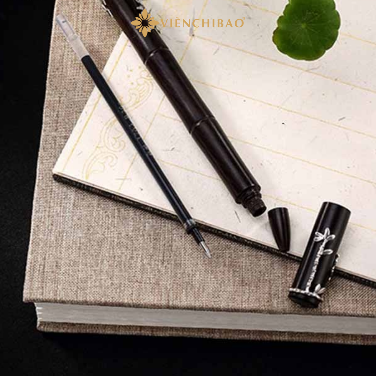 Bút Ký Đốt Trúc Bọc Bạc được chế tác tỉ mỉ với từng chi tiết mang đậm phong vị truyền thống. Thân bút được làm từ gỗ mun đen tự nhiên cao cấp, loại gỗ nổi tiếng bởi độ cứng, độ bóng và gam màu huyền bí. Các khớp “đốt trúc” được khắc nổi tinh tế, mô phỏng hình dáng cây trúc – biểu tượng của sự chính trực và kiên cường.