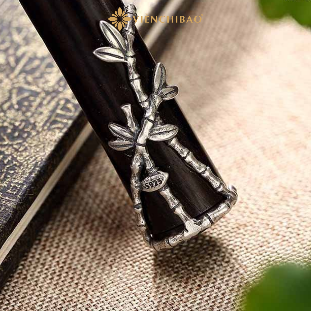 Điểm nhấn đặc biệt nằm ở phần bọc bạc S925 nguyên khối trên nắp và thân bút. Những chi tiết bạc được chế tác hoàn toàn thủ công, từng đường nét chạm khắc thể hiện hình ảnh cành trúc uốn lượn và lá bạc thanh mảnh, mang lại cảm giác sang trọng mà vẫn tinh tế.
