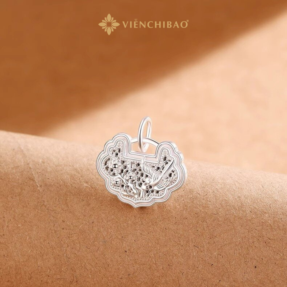 Charm Bạc S999 Hình Khóa Trường Mệnh Họa Tiết Chim Hoa Mai
