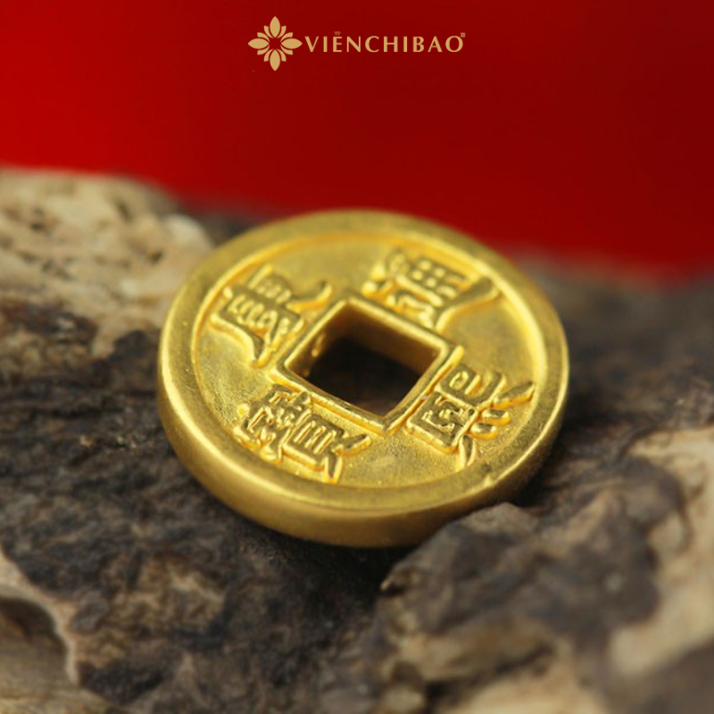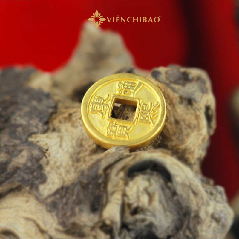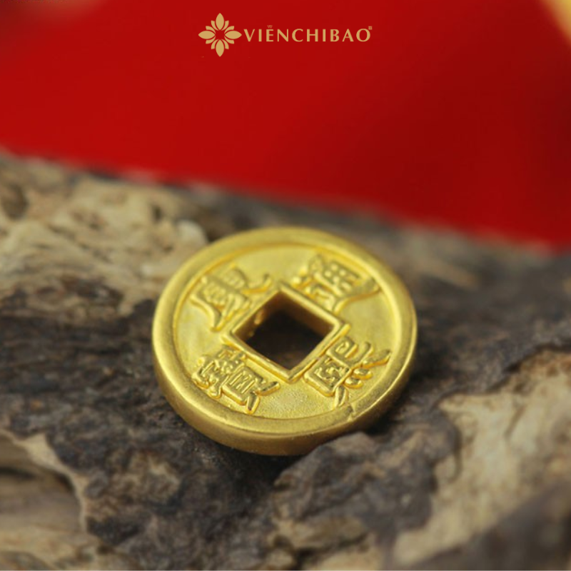 Charm Khang Hy Thông Bảo vàng 24K được chế tác tinh xảo từ vàng nguyên chất 99,99%. Thiết kế dựa trên đồng xu cổ thời Khang Hy, với hình tròn tượng trưng cho trời, lỗ vuông ở giữa tượng trưng cho đất – thể hiện quan niệm “thiên viên địa phương” trong triết lý Á Đông.
