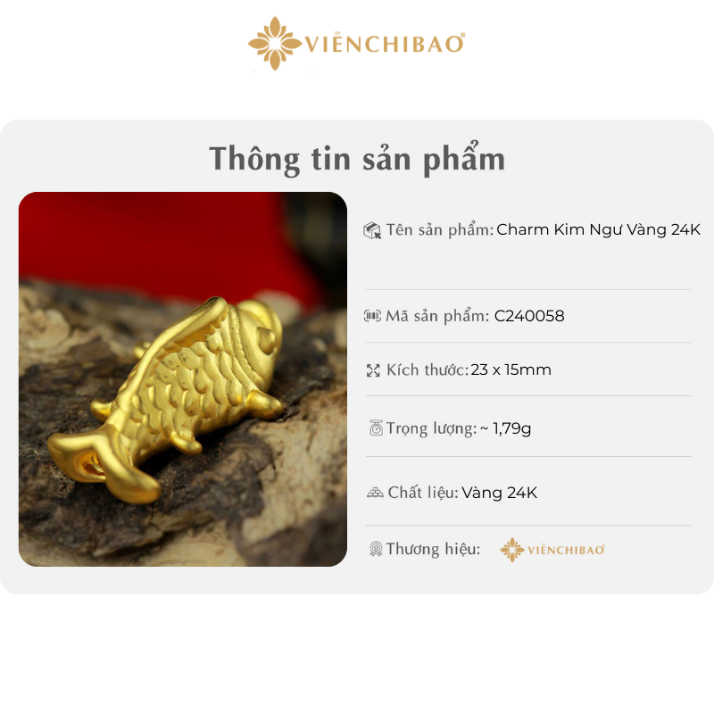 Lấy cảm hứng từ ý nghĩa linh thiêng ấy, Viễn Chí Bảo đã chế tác nên Charm Kim Ngư Vàng 24K – một tuyệt tác tinh xảo, gói trọn nét đẹp truyền thống và sự sang trọng hiện đại. Với hình dáng cá chép mềm mại, chi tiết vảy, vây, đôi mắt và miệng được khắc họa rõ nét, charm vừa mang tính nghệ thuật cao, vừa ẩn chứa giá trị phong thủy sâu sắc.