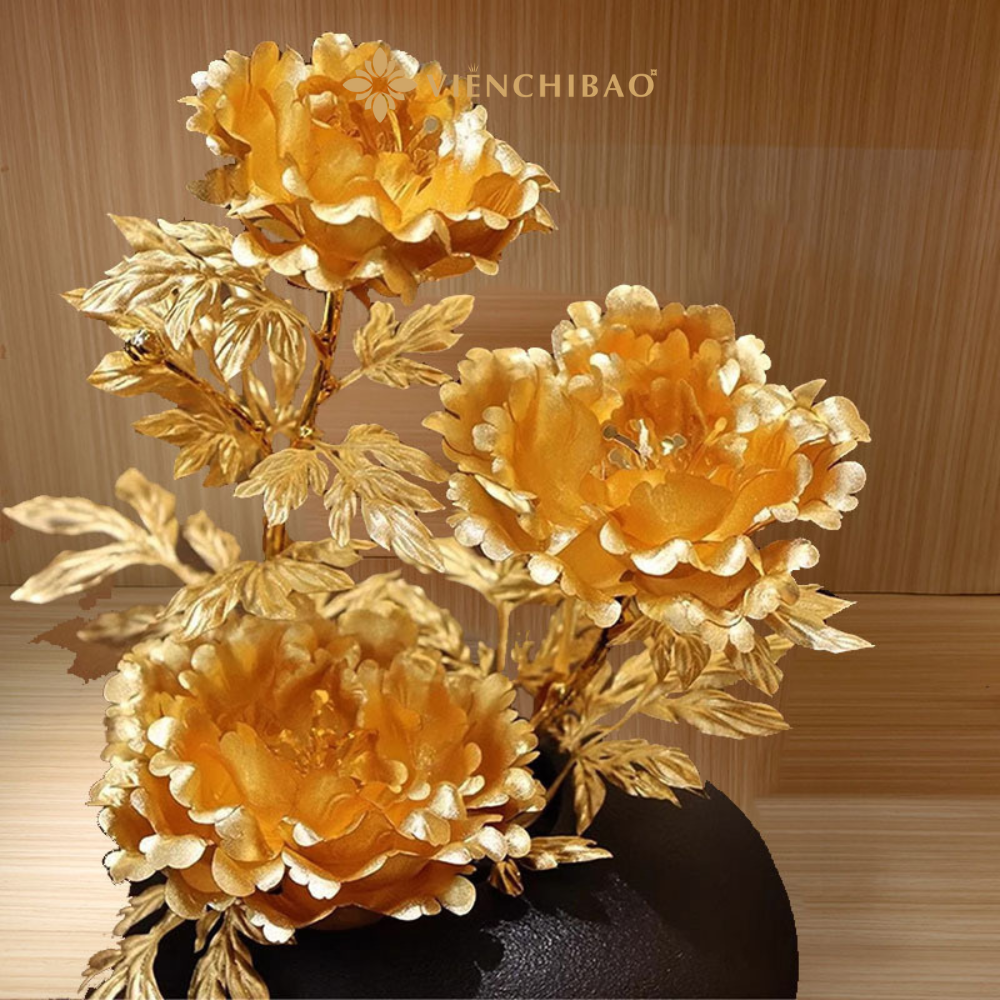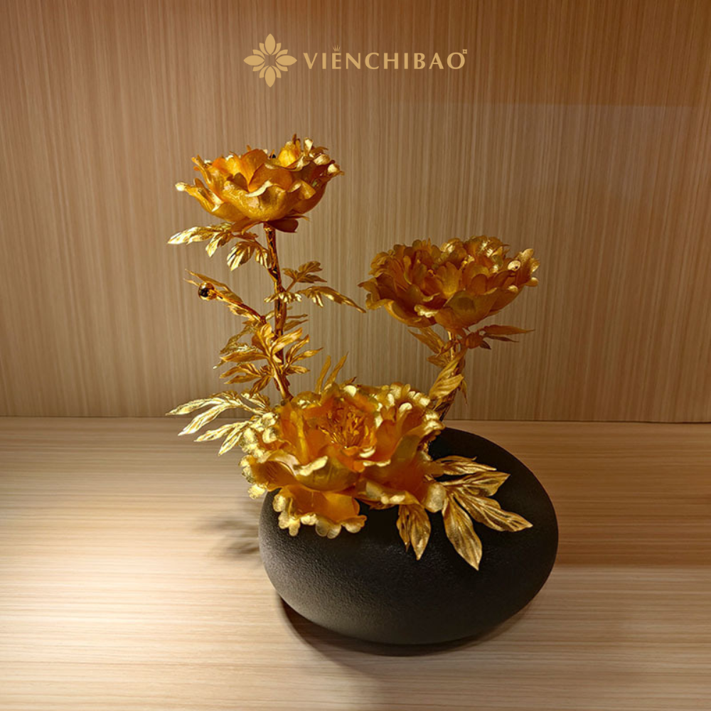 • Kết cấu và Chất liệu: Các bông hoa và nhành lá được làm từ chất liệu cao cấp dát vàng 24K, đảm bảo độ bền màu và sự rực rỡ trường tồn. Chậu cắm hoa có dáng tròn bầu, màu đen mờ (matte) tạo độ nhám tự nhiên, làm nền tảng vững chãi giúp sắc vàng kim thêm phần nổi bật và đẳng cấp. Từng chi tiết nhỏ nhất từ nụ hoa e ấp đến những đóa hoa mãn khai đều đạt độ tinh xảo tối đa, thể hiện tay nghề bậc thầy của người nghệ nhân.