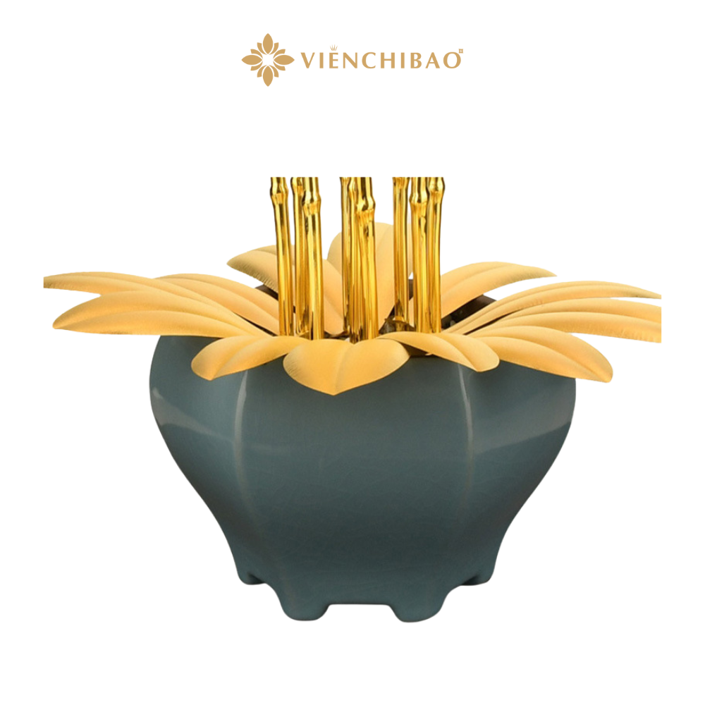 Kết cấu tổng thể: Các cành lan vươn thẳng đứng, tạo thế đối xứng hài hòa, cắm trong chậu sứ màu xanh thanh nhã, tượng trưng cho sự vững chãi và tươi mới. Sự kết hợp màu sắc giữa vàng kim, xanh ngọc và đen tạo nên một tổng thể uy nghiêm, sang trọng và đầy tính thẩm mỹ.