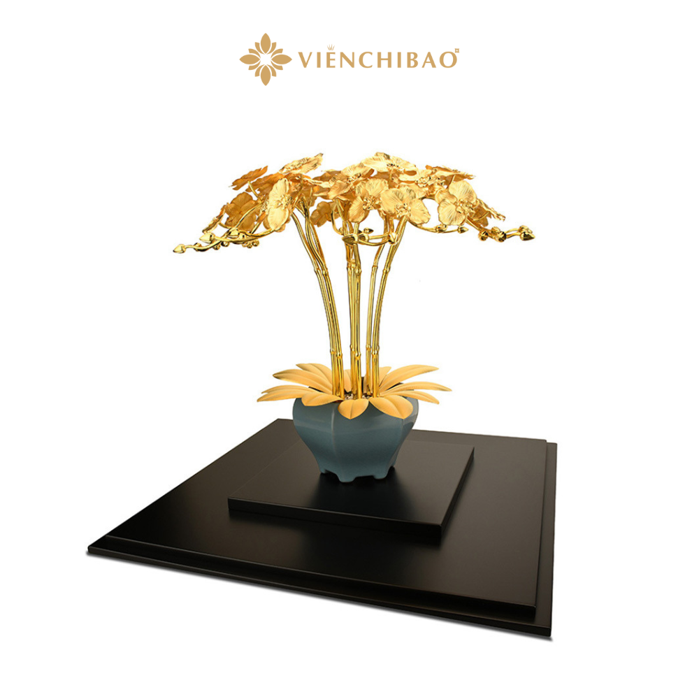 Chất liệu và hoàn thiện: Toàn bộ phần nhành hoa, cánh hoa và lá lan đều được phủ lớp vàng 24K rực rỡ, giúp tác phẩm tỏa sáng rực rỡ dưới mọi góc nhìn.