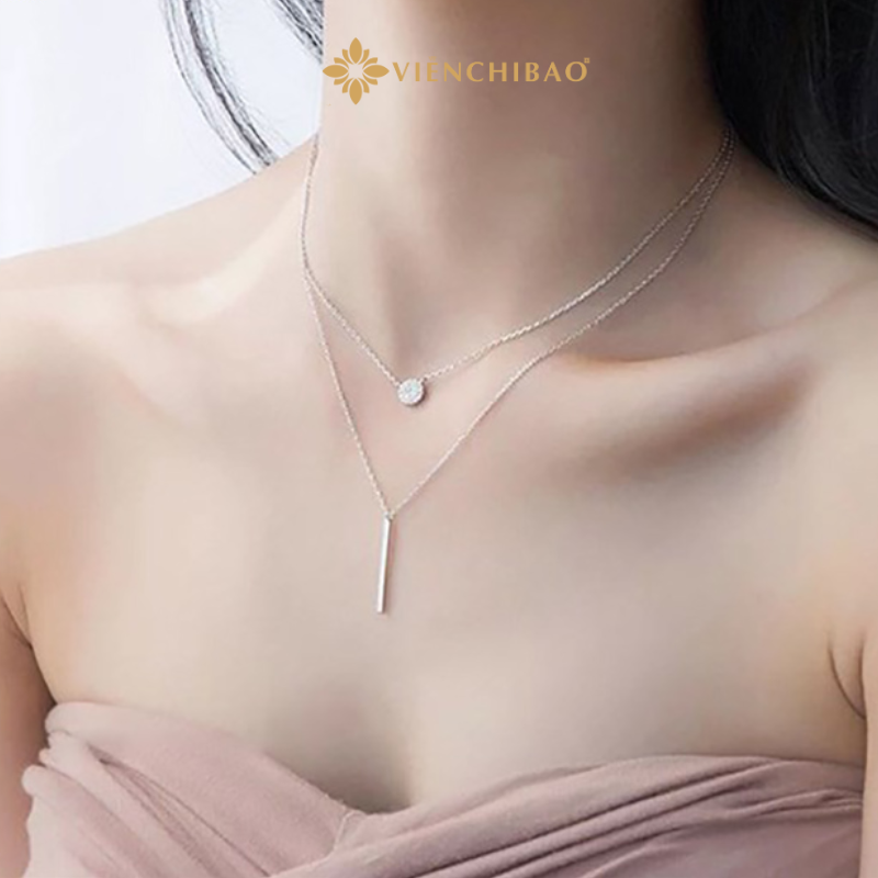 Thiết kế: Dây chuyền hai tầng tinh tế, mặt tròn đính đá cubic zirconia sáng như kim cương, kết hợp thanh bạc nhỏ tạo cảm giác thanh thoát và thời trang.