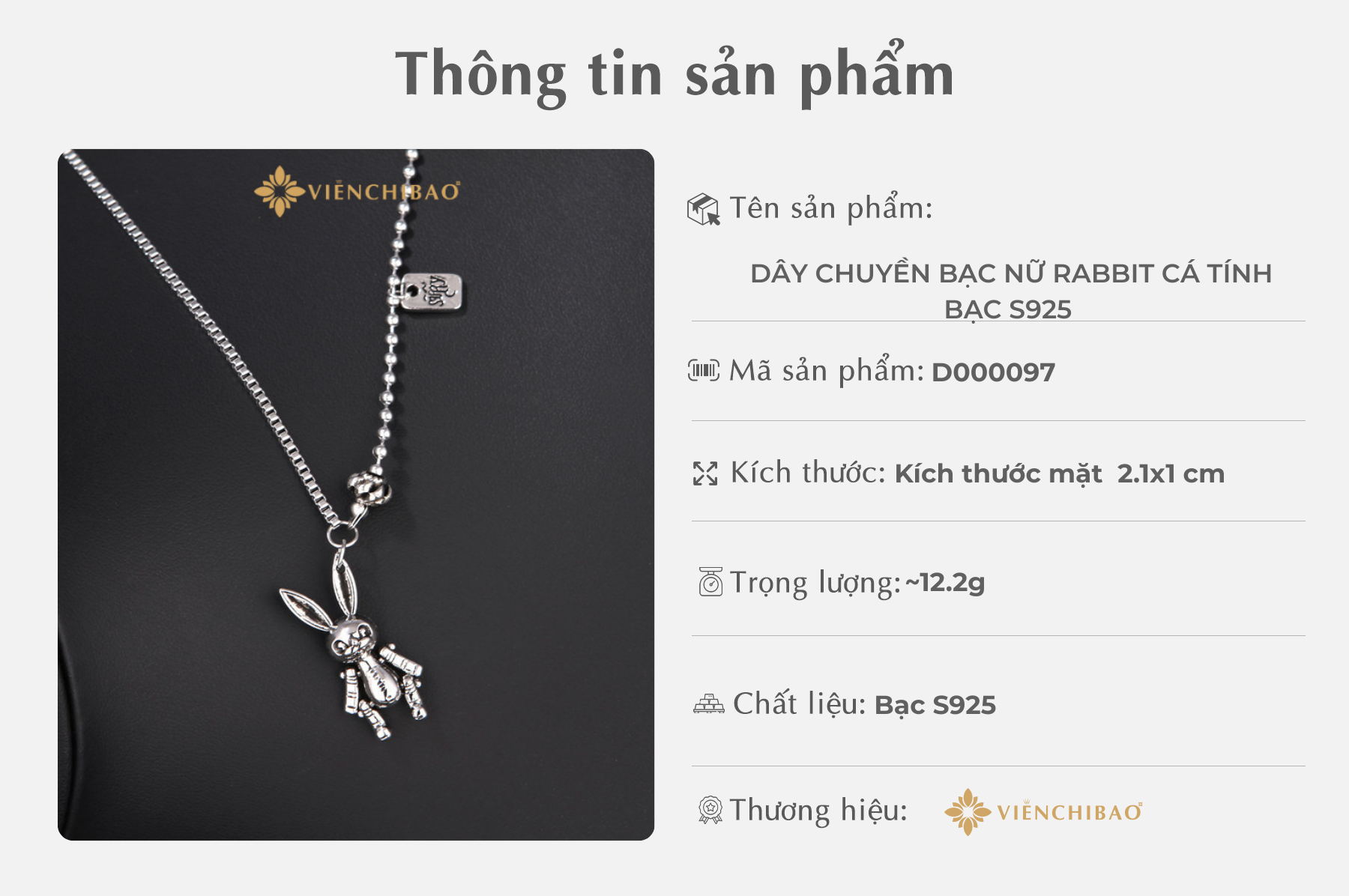 Viễn Chí Bảo hân hạnh giới thiệu đến bạn mẫu dây chuyền bạc nữ Rabbit cá tính, một thiết kế độc quyền mang hơi thở hiện đại và nét tinh nghịch riêng biệt. Chúng tôi tin rằng, mỗi cô gái khi đeo chiếc dây chuyền này đều sẽ tìm thấy một phần cá tính của mình trong đó – dám khác biệt, dám là chính mình.