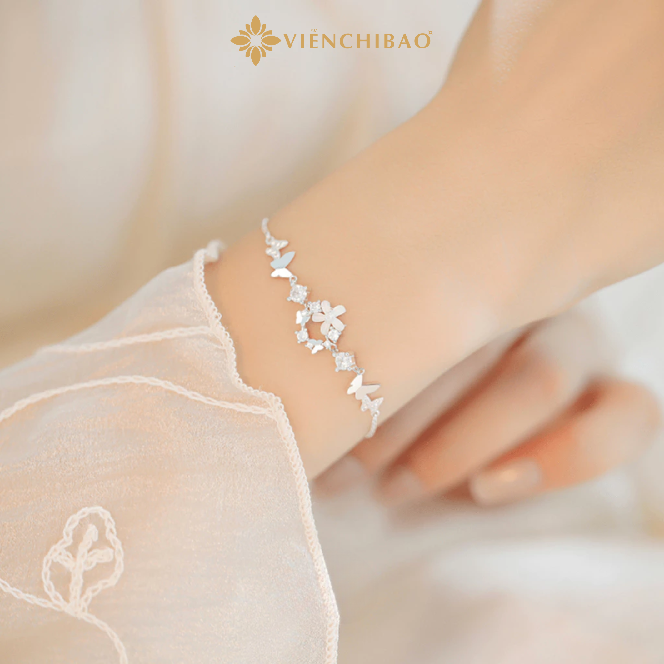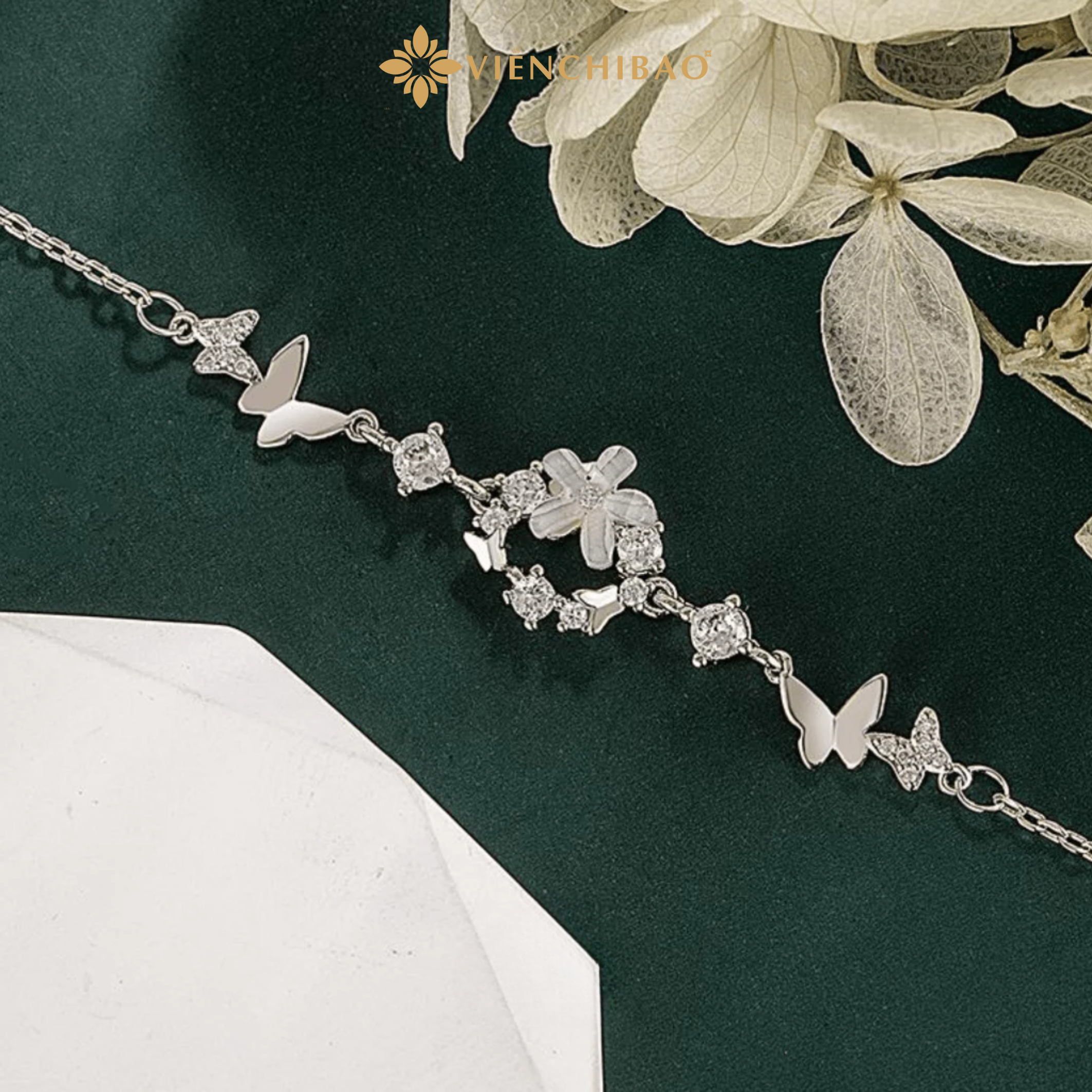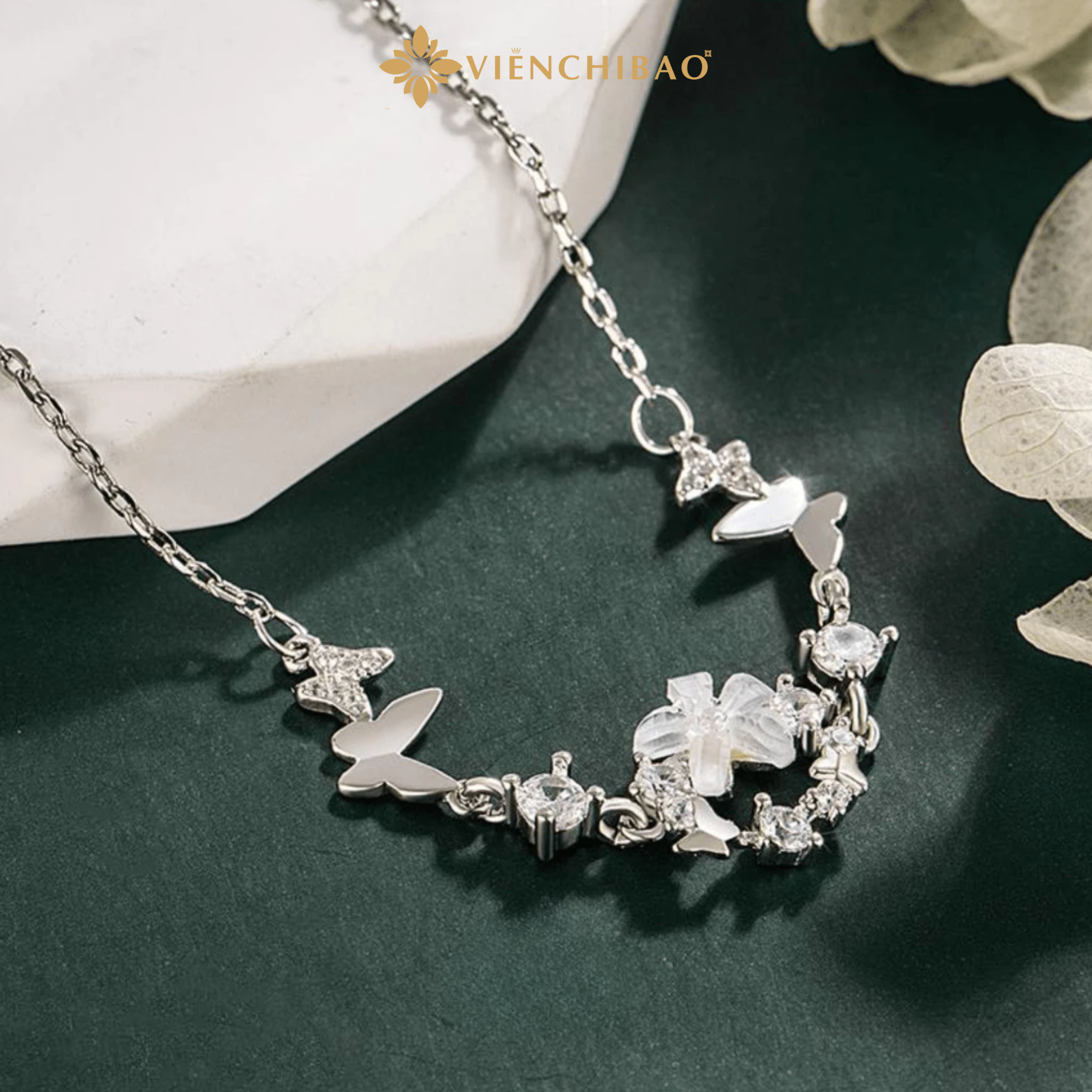 Chiếc dây chuyền được chế tác từ bạc S925 cao cấp, đảm bảo vẻ trắng sáng, bền đẹp cùng thời gian. Điểm nhấn là mặt hồ điệp với họa tiết hoa đá, kết hợp giữa hình ảnh bướm nhẹ nhàng và hiệu ứng đá đính lấp lánh. Khi ánh sáng chiếu vào, mặt dây phản chiếu ánh sáng từ đá, giúp tạo hiệu ứng thu hút. Dây mảnh mềm và nhẹ, kết hợp cùng khóa chắc chắn giúp dây ôm vừa cổ mà vẫn thoải mái khi đeo kéo dài.