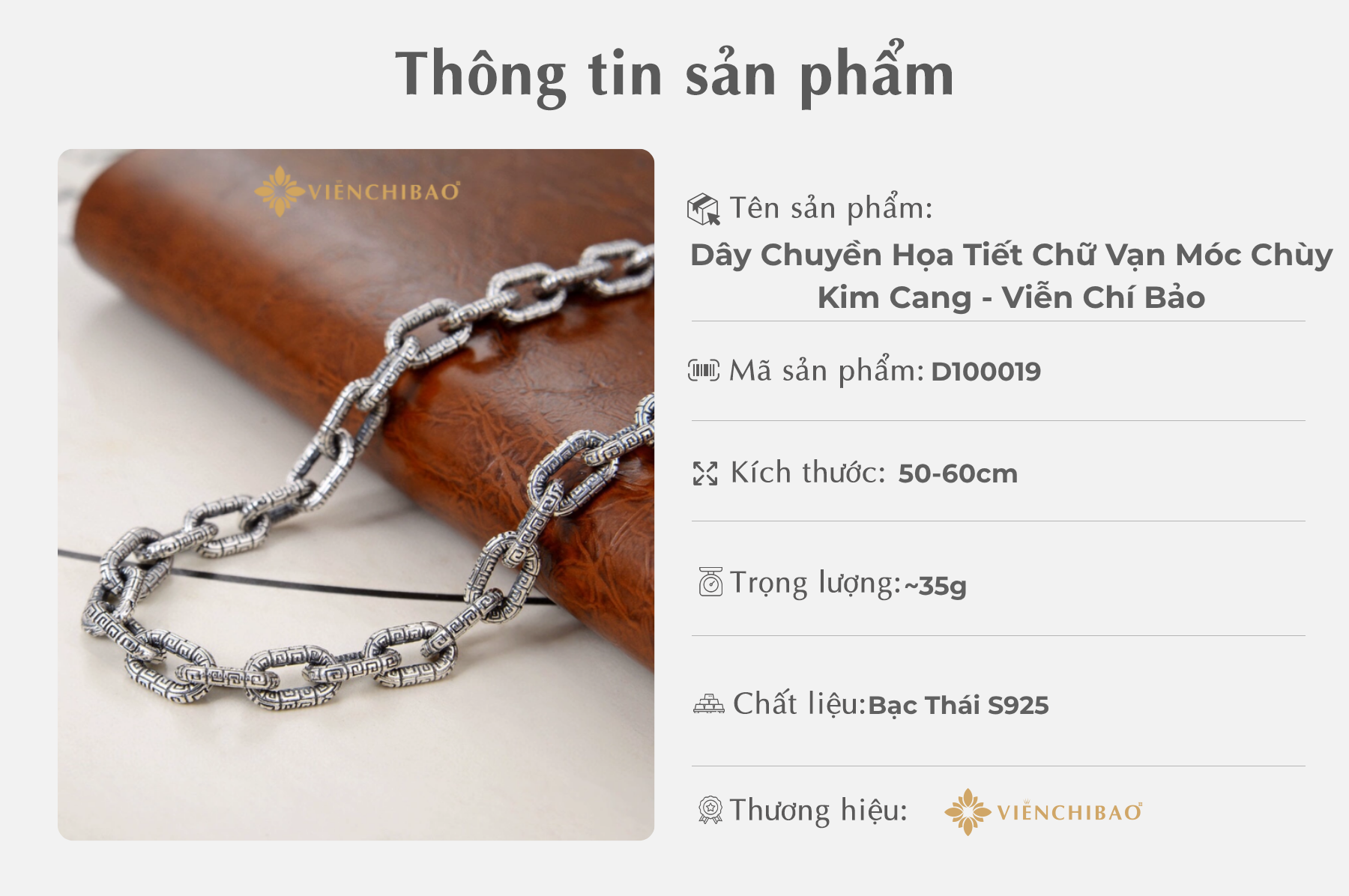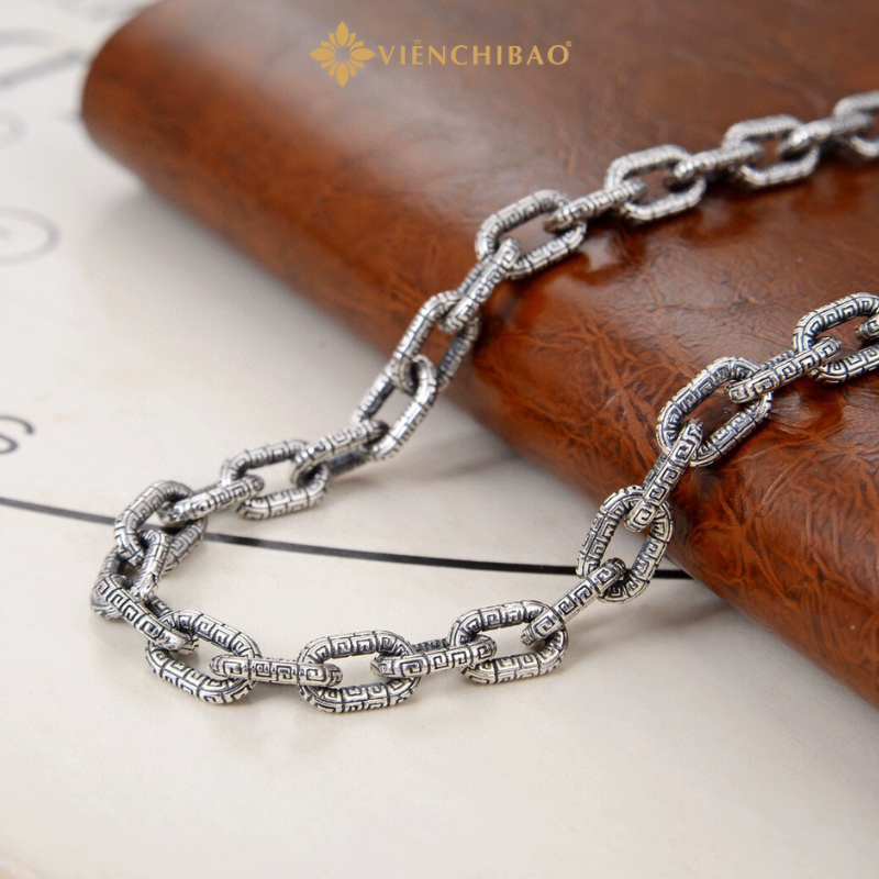 Điểm nhấn của mẫu Dây Chuyền Họa Tiết Chữ Vạn nằm ở từng mắt xích được chạm khắc tinh xảo hoa văn chữ Vạn theo họa tiết cổ phương Đông. Hoa văn chạy bao quanh từng mắt dây theo phong cách đối xứng, tạo nên vẻ đẹp mạnh mẽ nhưng vẫn tinh tế. Chữ Vạn mang ý nghĩa vĩnh hằng, đại diện cho phúc đức, trạng thái an lạc và bình an trong mọi khía cạnh của cuộc sống.