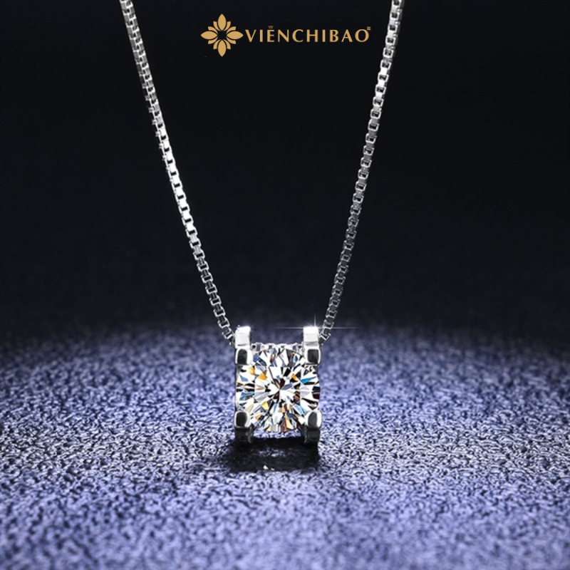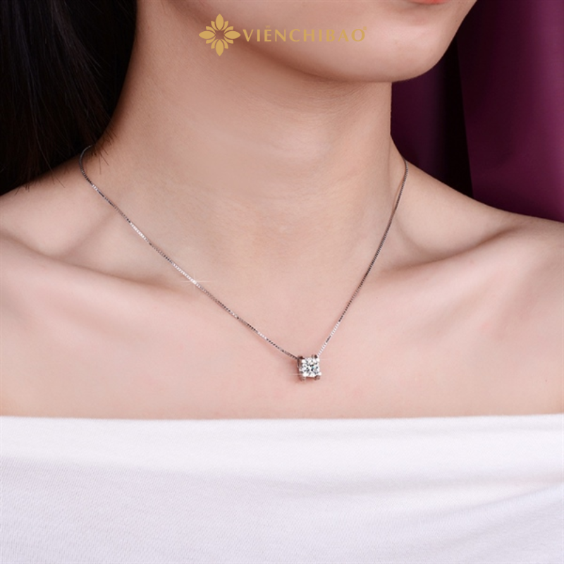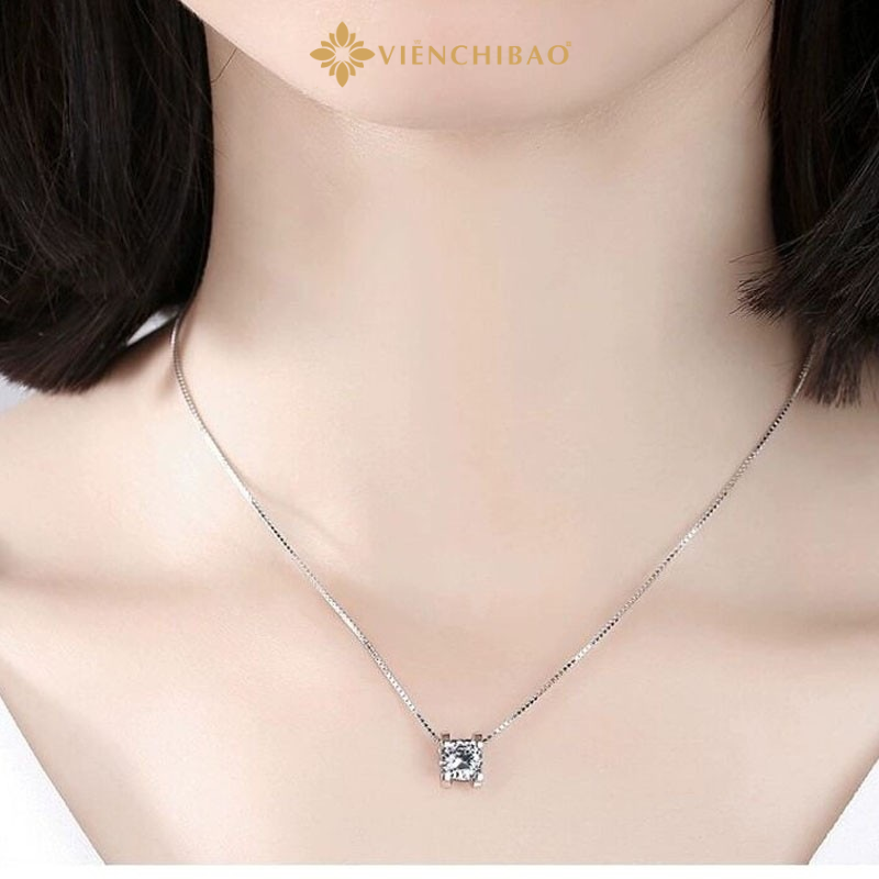 Thiết kế: Mặt dây chuyền đính đá CZ (Cubic Zirconia) cắt vuông, sắc nét, nổi bật với độ phản chiếu cao dưới ánh sáng. Đá được giữ chắc chắn bằng 4 chấu, vừa thẩm mỹ vừa bền bỉ.