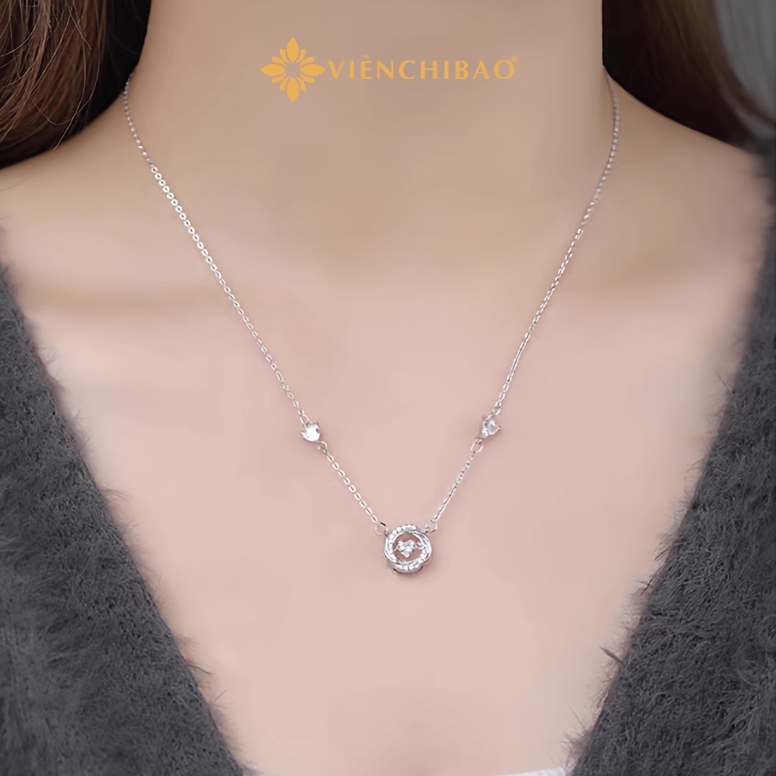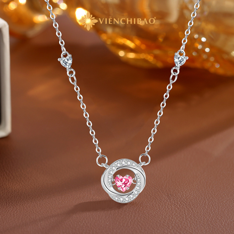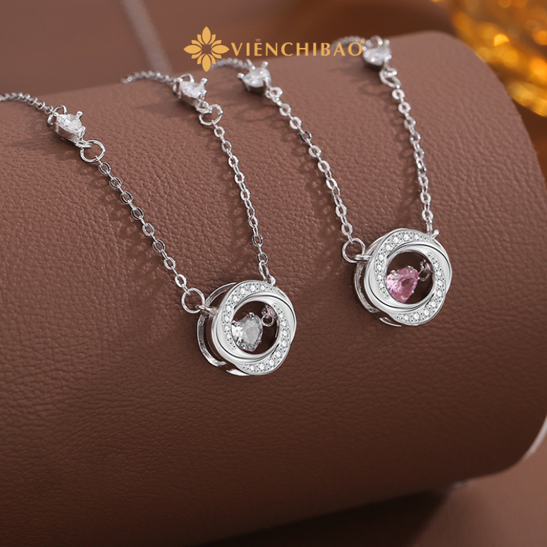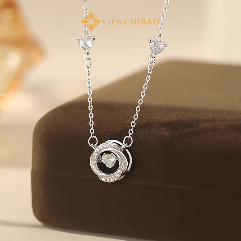 Kiểu dáng: Mặt dây chuyền xoắn kép, kết hợp giữa đường tròn mềm mại và trung tâm đá trái tim lấp lánh.