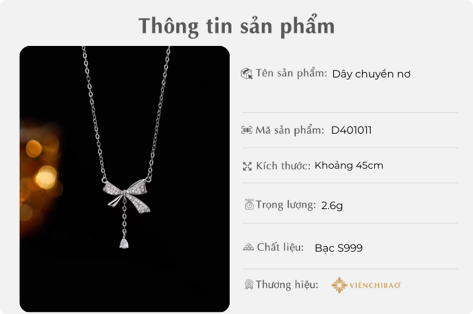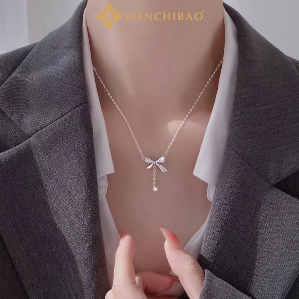 • Chi tiết đặc trưng: Viên đá CZ chủ điểm tại trung tâm nơ cùng các viên nhỏ xung quanh tạo hiệu ứng ánh sáng khi di chuyển; dây chuyền thanh mảnh ôm lấy xương quai xanh giúp tổng thể nhẹ nhàng nhưng nổi bật. Trọng lượng khoảng 2,61 g.