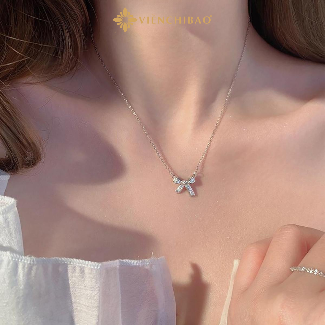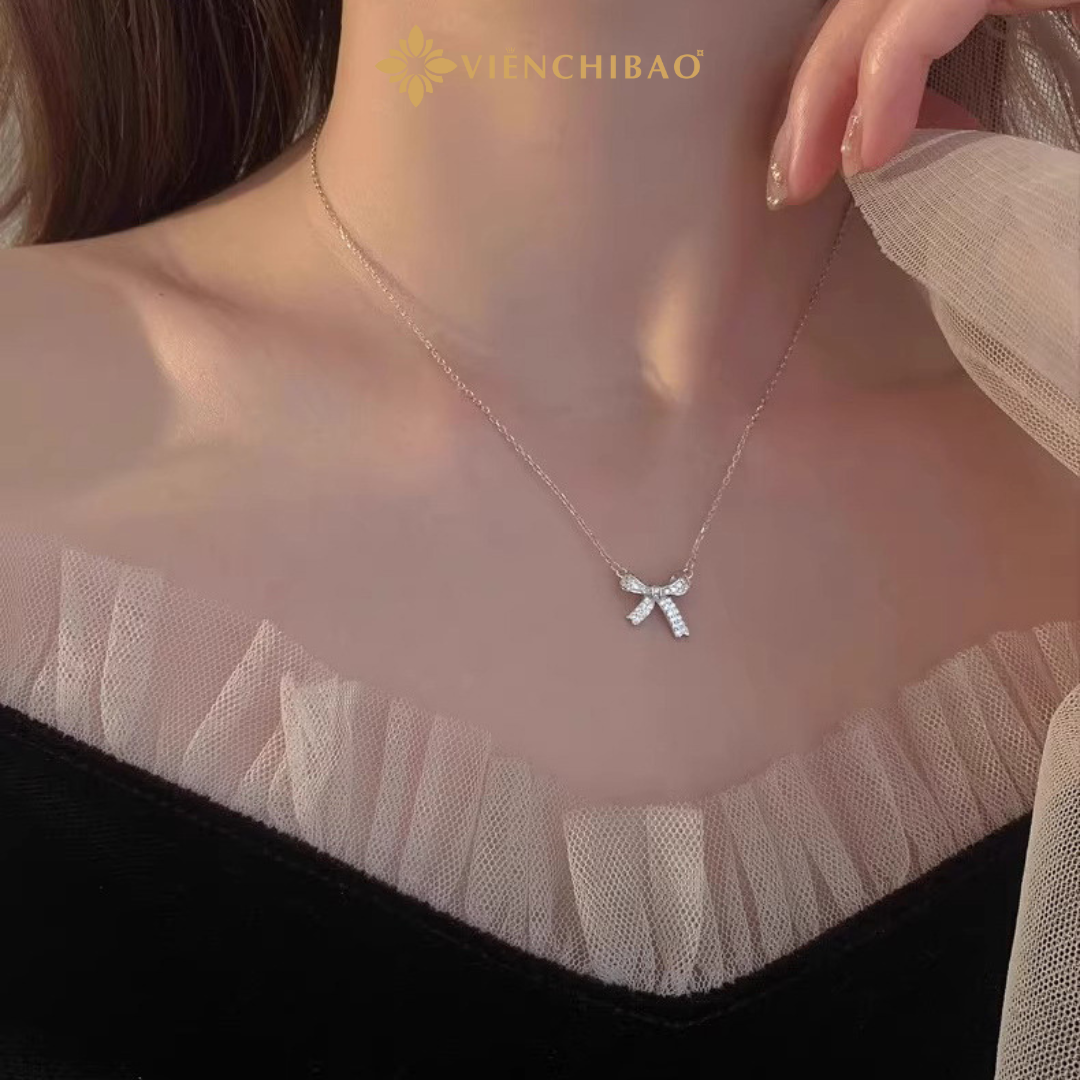 Điểm nhấn đặc biệt nằm ở phần đính đá CZ lấp lánh, được gắn dọc theo từng cánh nơ, tạo hiệu ứng phản chiếu ánh sáng lung linh, giúp chủ nhân trở nên nổi bật trong mọi khoảnh khắc. Sợi dây chuyền thanh mảnh, ôm lấy xương quai xanh, khiến tổng thể trở nên thanh thoát, tôn lên nét quyến rũ tự nhiên của phái đẹp.