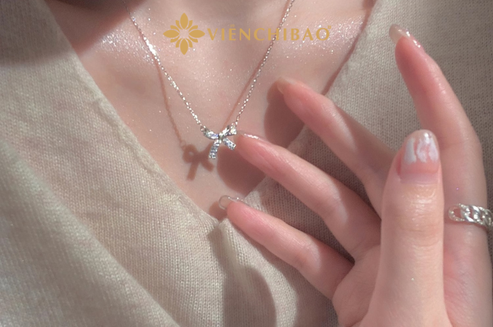 Lấy cảm hứng từ ý nghĩa đó, các nghệ nhân Viễn Chí Bảo đã sáng tạo nên mẫu dây chuyền nơ đính đá, biến chiếc nơ nhỏ bé thành một tác phẩm trang sức mang tính thẩm mỹ cao. Mỗi viên đá CZ được gắn lên như những ánh sao lấp lánh, tượng trưng cho niềm vui, hạnh phúc và ánh sáng hy vọng trong cuộc sống.