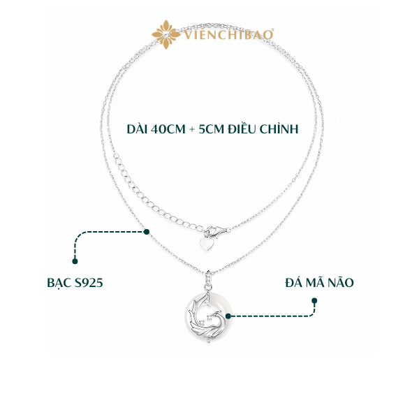 Kiểu dáng: Mặt dây chuyền là viên đá Mã Não trắng trong suốt, được ôm trọn bởi hình tượng chim Phượng Ngọc chạm khắc tinh xảo bằng bạc. Với độ dài 40cm + 5cm đoạn dây điều chỉnh, giúp dễ dàng thay đổi độ dài phù hợp với nhiều dáng cổ.