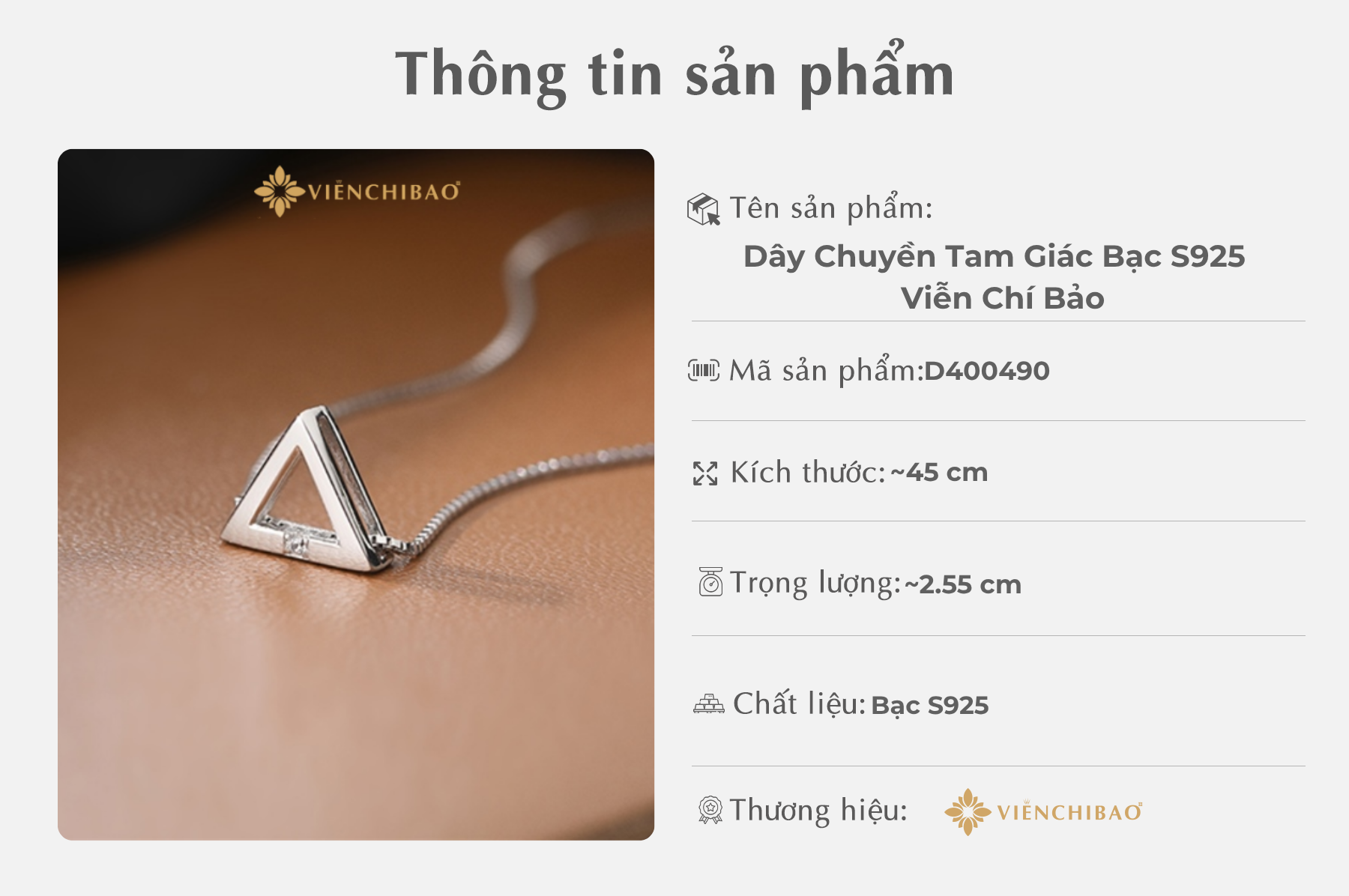 Chiếc Dây Chuyền Tam Giác Bạc S925 của Viễn Chí Bảo mang đến một vẻ đẹp tối giản nhưng cuốn hút, kết hợp giữa hình học hiện đạiđơn giản tinh tế. Lấy cảm hứng từ hình dáng tam giác, một trong những hình học cơ bản nhất nhưng đầy mạnh mẽ và vững chãi, thiết kế này truyền tải thông điệp về sự ổn định và sức mạnh nội tại.