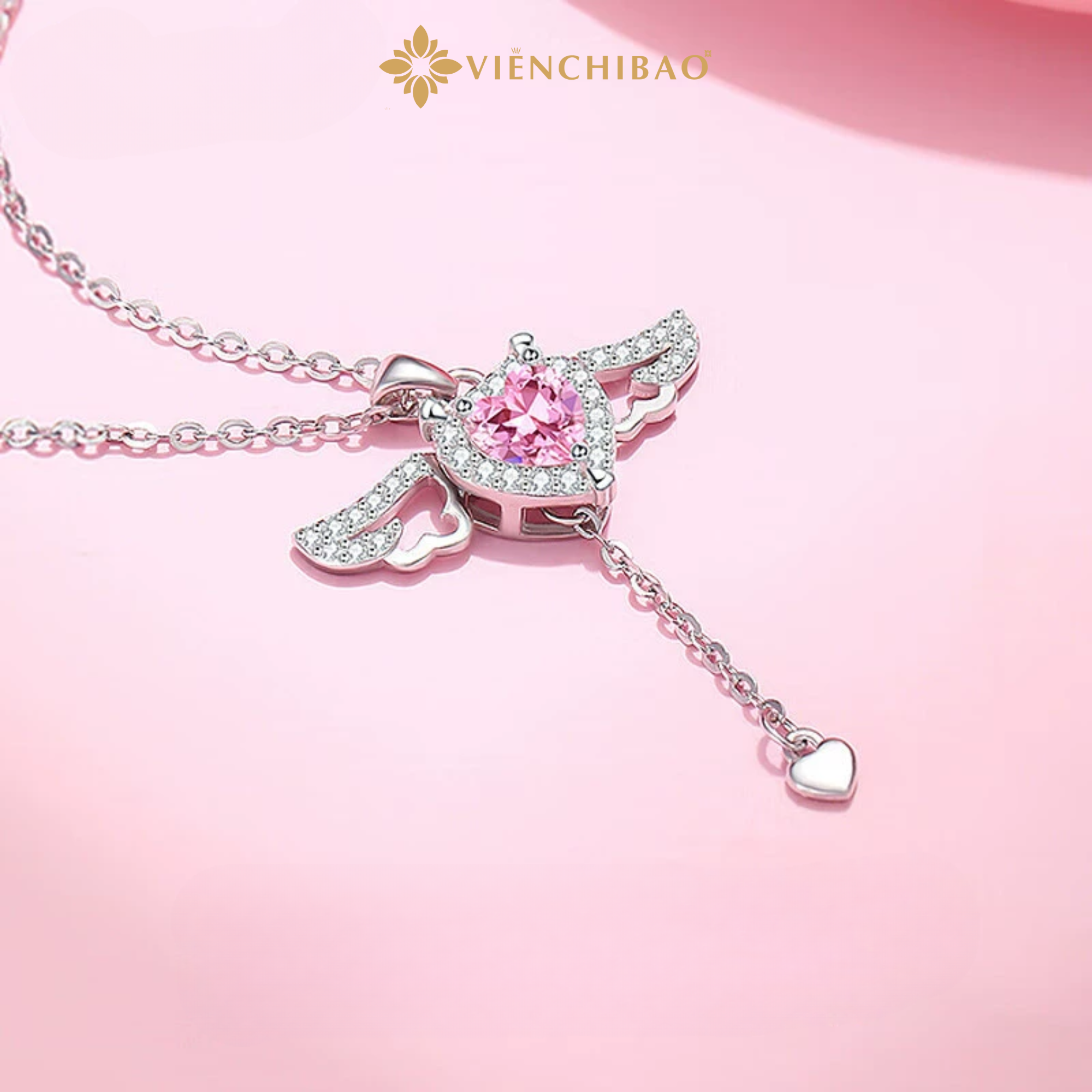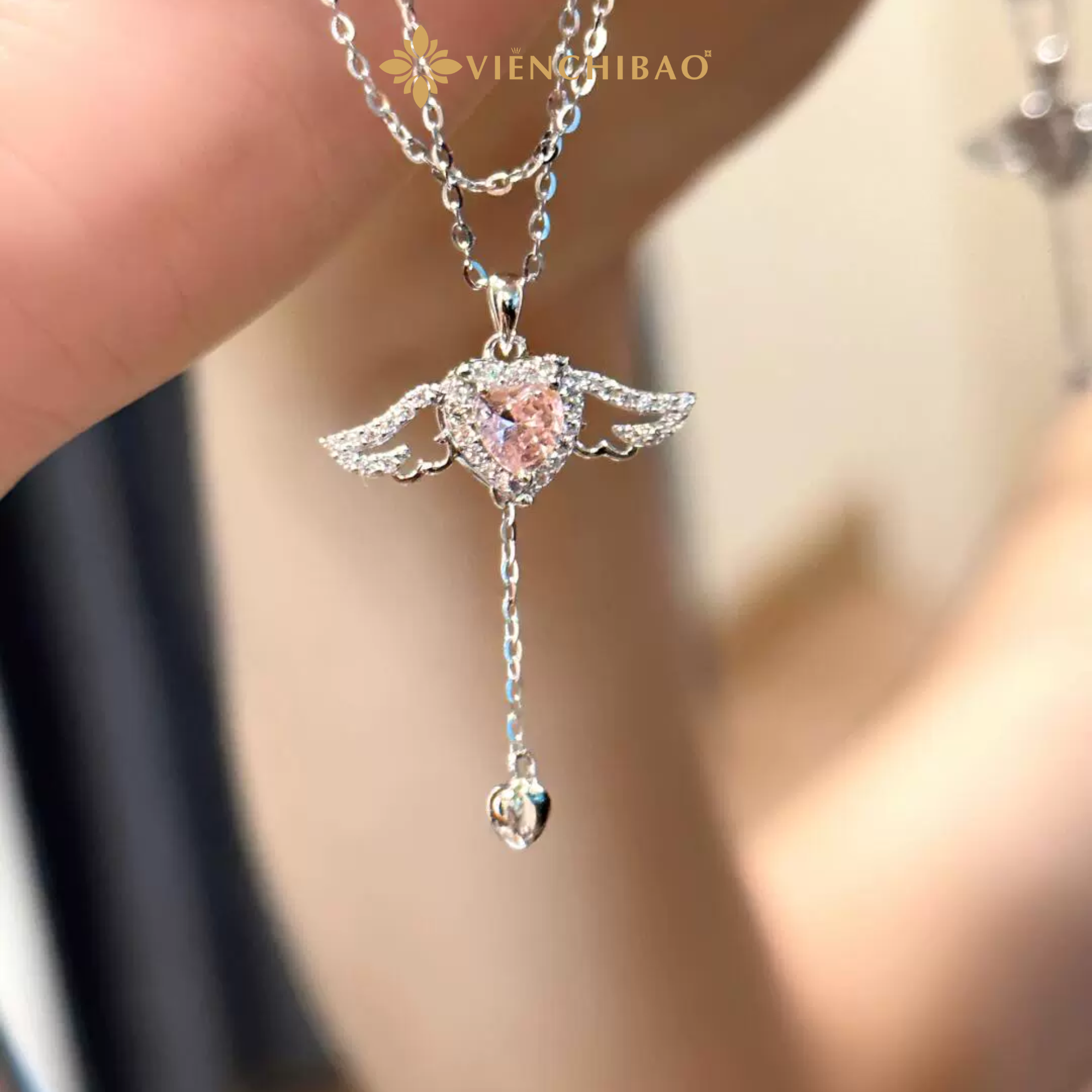 Điểm nhấn tinh tế nằm ở mặt dây hình đôi cánh thiên thần mềm mại, được gắn đá CZ (Zircon) lấp lánh. Những viên đá nhỏ được đính khéo léo dọc theo viền cánh, tạo hiệu ứng tỏa sáng lung linh mỗi khi ánh sáng chạm vào, giúp người đeo trở nên nổi bật và cuốn hút.