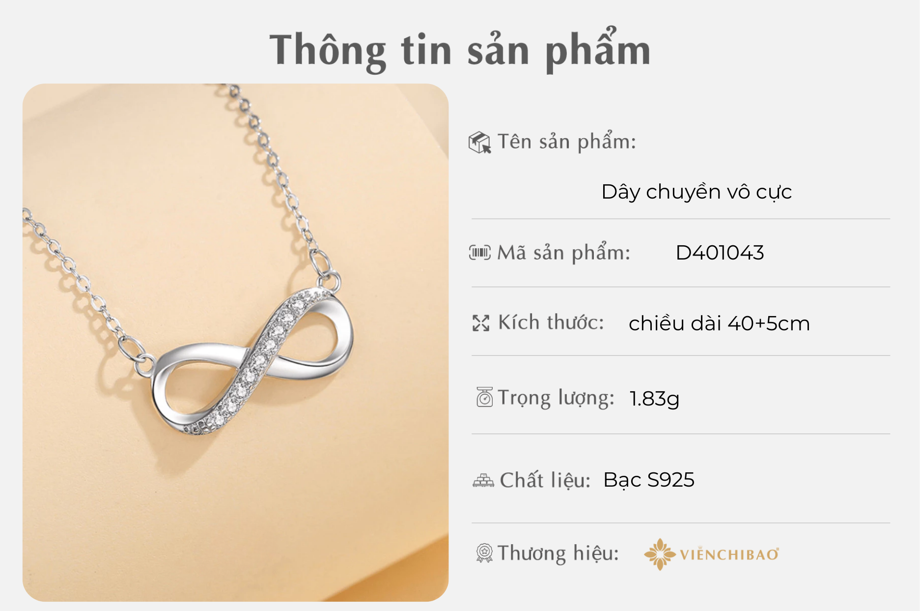 Chiếc dây chuyền được chế tác từ bạc S925 cao cấp, mang sắc trắng sáng, tinh khiết và bền đẹp theo thời gian. Điểm nhấn là mặt biểu tượng Vô Cực (∞), tượng trưng cho sự bất tận, trường tồn và tình cảm bền vững. Thiết kế mặt dễ nhìn, không quá cầu kỳ nhưng vẫn tinh tế và sang trọng, phù hợp với nhiều phong cách.