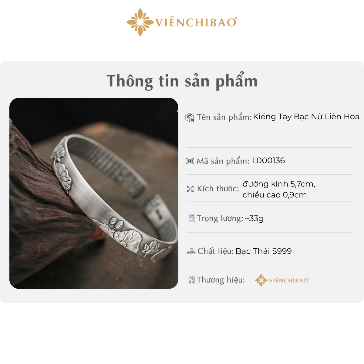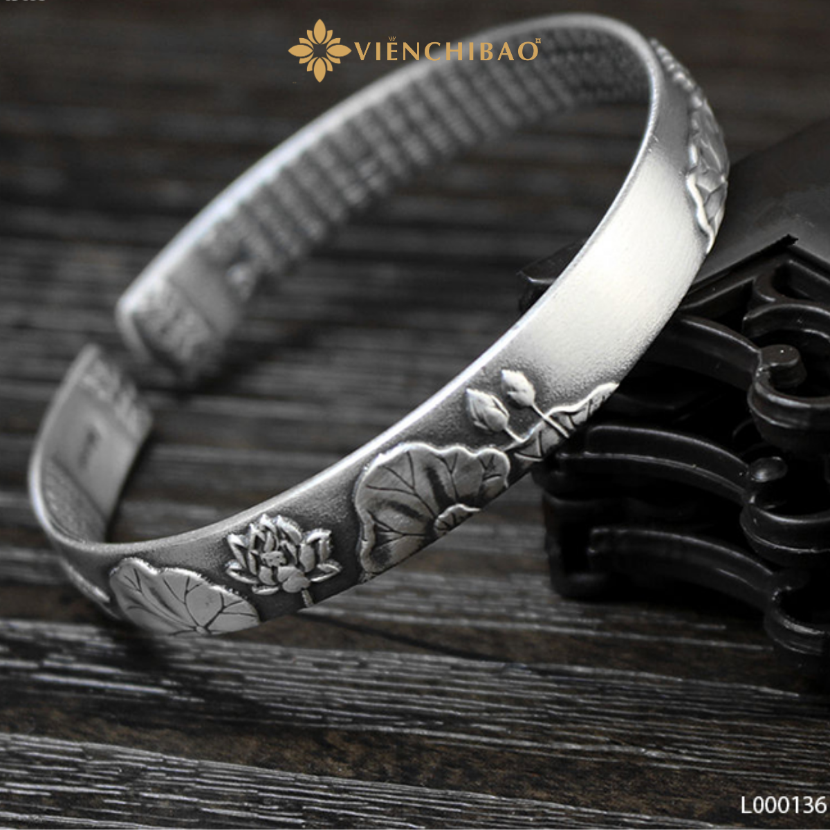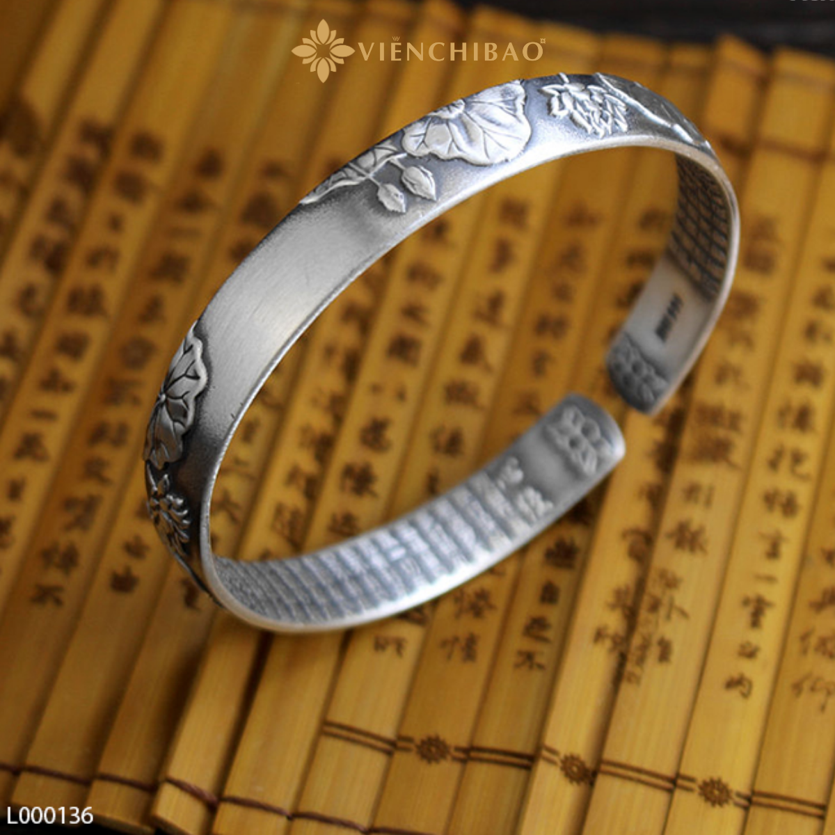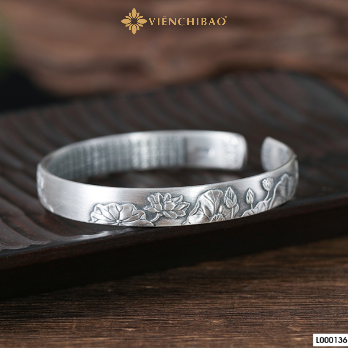 Kiềng tay bạc nữ liên hoa được chế tác thủ công tỉ mỉ từ bạc nguyên chất S990, đạt độ tinh khiết cao, sáng bóng và an toàn cho da. Bề mặt bạc được xử lý oxy hóa nhẹ theo phong cách cổ điển, tạo nên hiệu ứng tương phản rõ nét giữa nền bạc mờ và những họa tiết khắc nổi tinh tế.