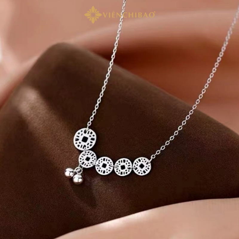 Thiết kế gồm chuỗi họa tiết kim tiền liền nhau cùng hai hạt bạc nhỏ đính giữa, tạo cảm giác chuyển động mềm mại và nhẹ nhàng khi đeo. Dưới bàn tay khéo léo của các nghệ nhân Viễn Chí Bảo, từng chi tiết được hoàn thiện tinh xảo, giữ nguyên nét thanh lịch nhưng vẫn toát lên vẻ sang trọng và hiện đại.