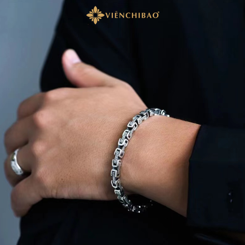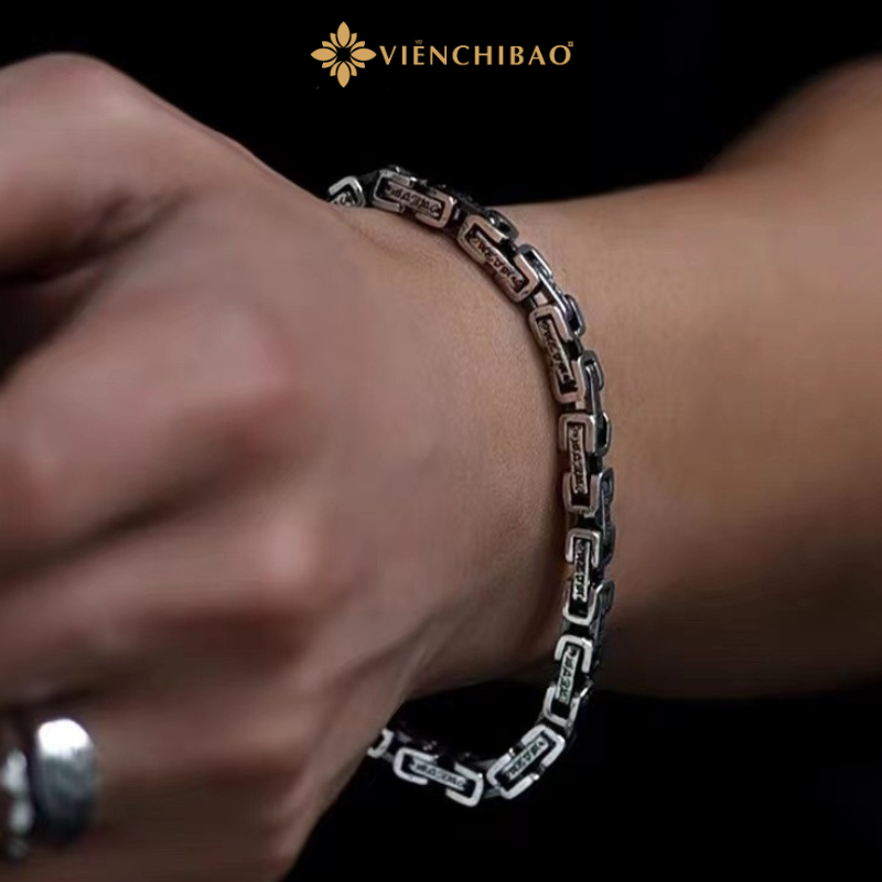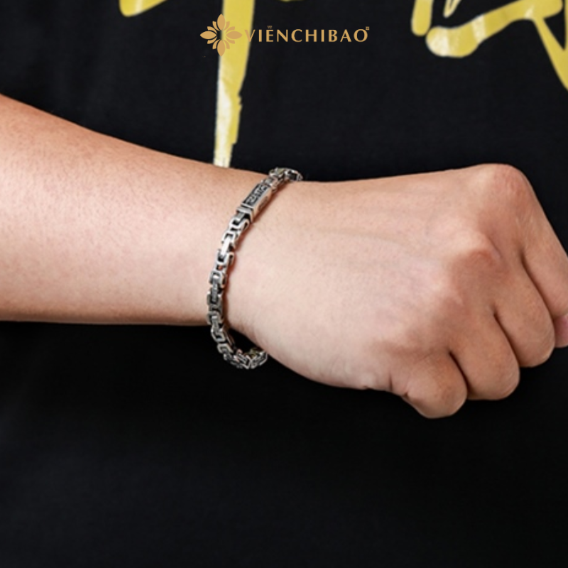 Lắc Tay Bạc Nam Lục Tự Vương Hóa Long là món trang sức tinh tế pha lẫn yếu tố phong thủy và quyền lực. Sản phẩm được chế tác từ bạc Thái S925 chất lượng cao, thiết kế mắt xích bản lớn tương tự vảy rồng, trên mỗi mắt được khắc “Lục Tự” (mantra “Om Mani Padme Hum”) — mang nét thần bí, sâu sắc. Khi đeo, lắc tay tạo cảm giác mạnh mẽ nhưng vẫn rất linh hoạt, thể hiện phong cách nam tính, sang trọng và giàu ý nghĩa tâm linh.