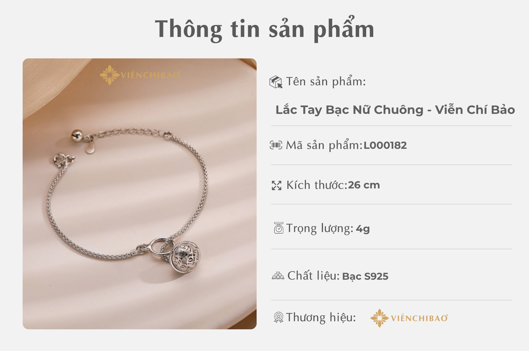 Viễn Chí Bảo luôn cam kết mang đến những sản phẩm trang sức chất lượng, với từng chi tiết được chế tác tỉ mỉ bởi đội ngũ thợ lành nghề. Lắc tay bạc nữ Chuông không chỉ là món đồ trang sức đẹp mắt mà còn là món quà chứa đựng nhiều ý nghĩa tốt đẹp. Cảm ơn bạn đã tin tưởng và lựa chọn Viễn Chí Bảo đồng hành trong những khoảnh khắc quan trọng của cuộc sống.