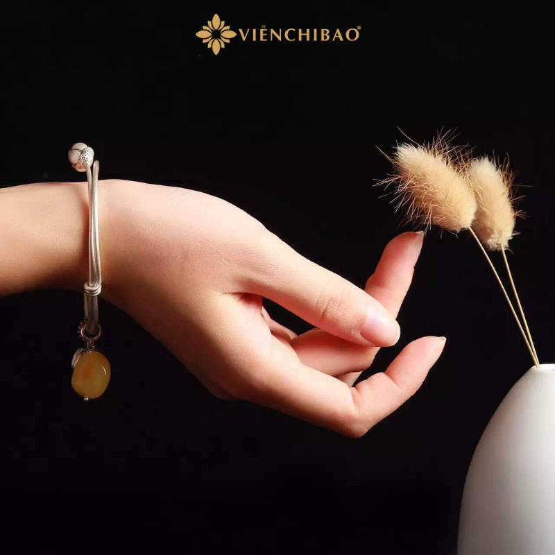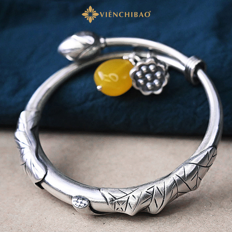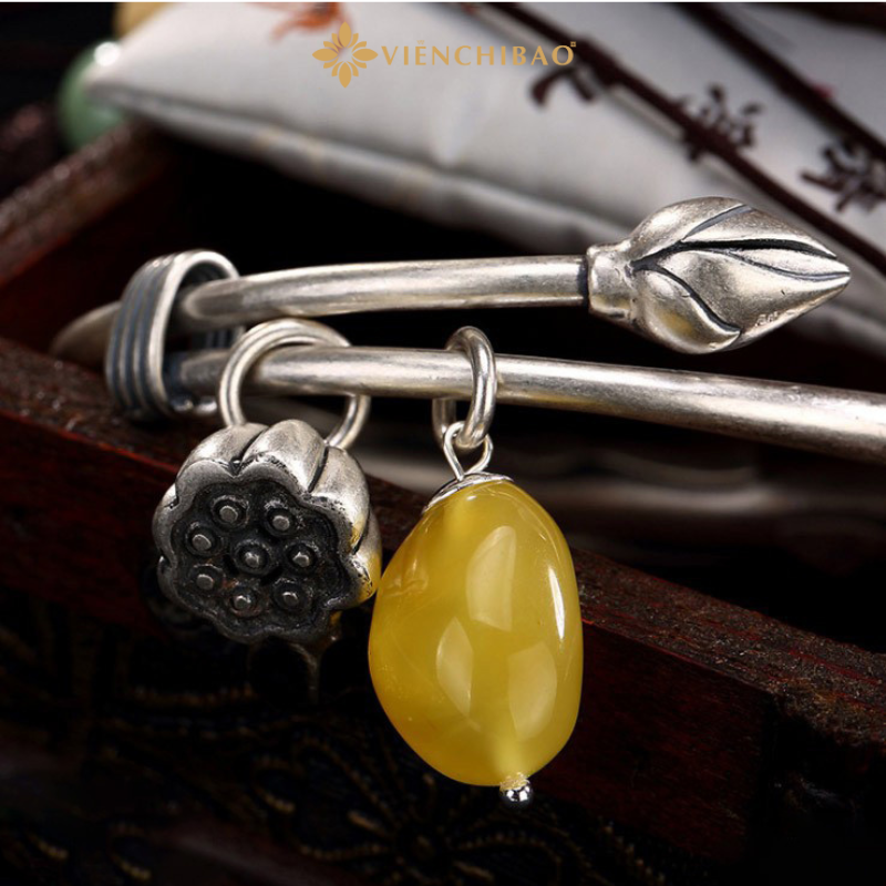Lắc tay bạc nữ mix charm đài sen và đá mã não vàng là một dạng biến thể của thạch anh thuộc nhóm Chalcedony. Theo phong thủy phương đông đá mã não là biểu tượng của sức khỏe, sự hưng thịnh và trường thọ. Đồng thời đá mã não còn giúp lưu thông mạch máu, hỗ trợ tiêu hóa và xoa dịu cơn đau.