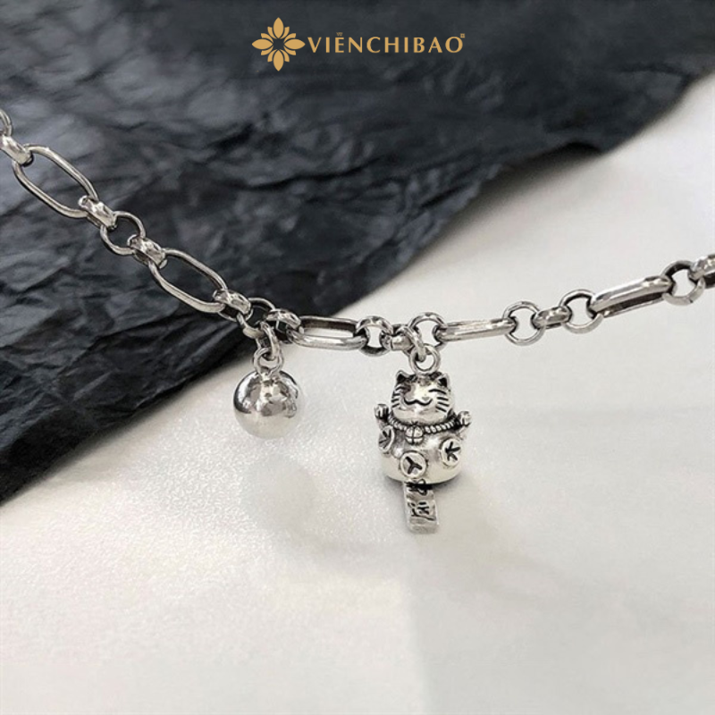 Thiết kế: Dây xích dạng oval kết nối bằng khoen cứng chắc, với hai charm đặc trưng – một Mèo Thần Tài và một quả cầu bạc trơn.