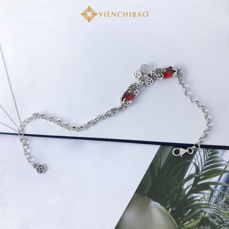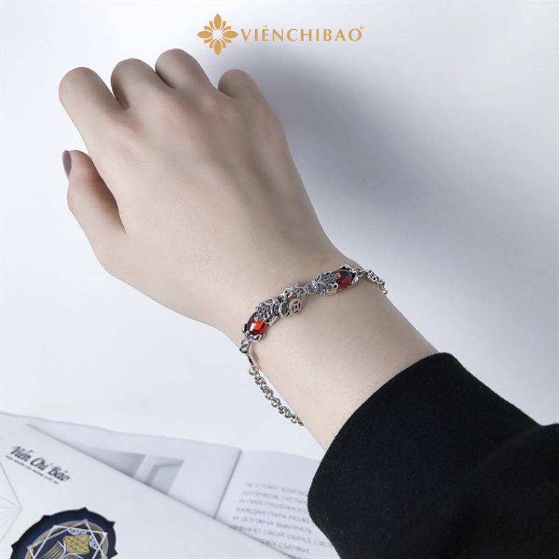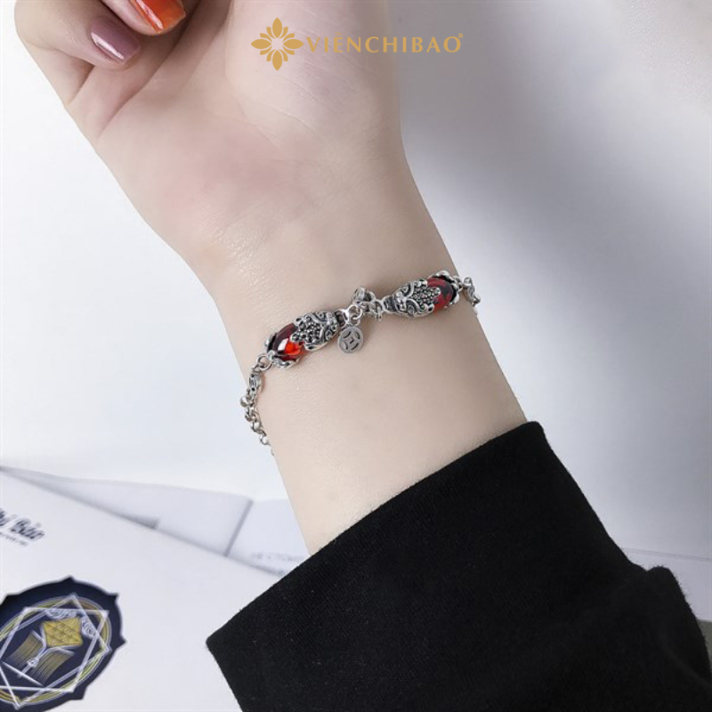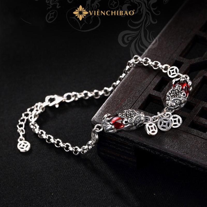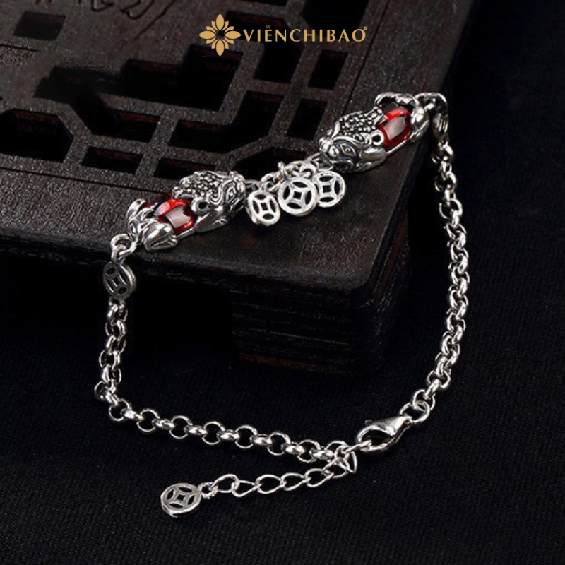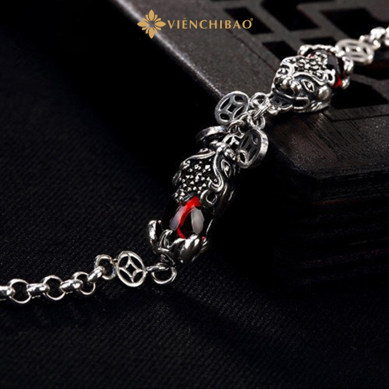 Mỗi chi tiết của chiếc lắc được gia công tỉ mỉ từ chất liệu bạc S925 chuẩn quốc tế – một trong những loại bạc được ưa chuộng nhất hiện nay nhờ độ bền, sáng bóng và an toàn cho làn da. Hai linh vật Tỳ Hưu được chạm khắc nổi bật hai bên trung tâm, kết hợp cùng đá đỏ nhân tạo mang đến điểm nhấn sang trọng và hút mắt.