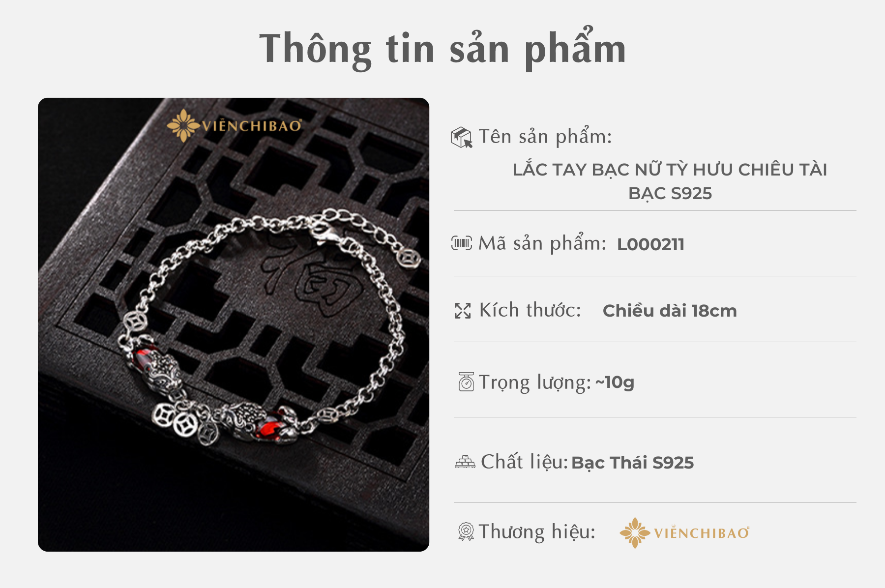 Viễn Chí Bảo luôn tin rằng, mỗi món trang sức đều là một biểu tượng mang năng lượng và câu chuyện riêng. Với mẫu lắc tay bạc nữ Tỳ Hưu chiêu tài – bạc S925, chúng tôi hy vọng không chỉ mang đến một sản phẩm đẹp về hình thức, mà còn là vật phẩm phong thủy đồng hành cùng bạn trong hành trình thu hút tài lộc, đón nhận những điều tốt lành.