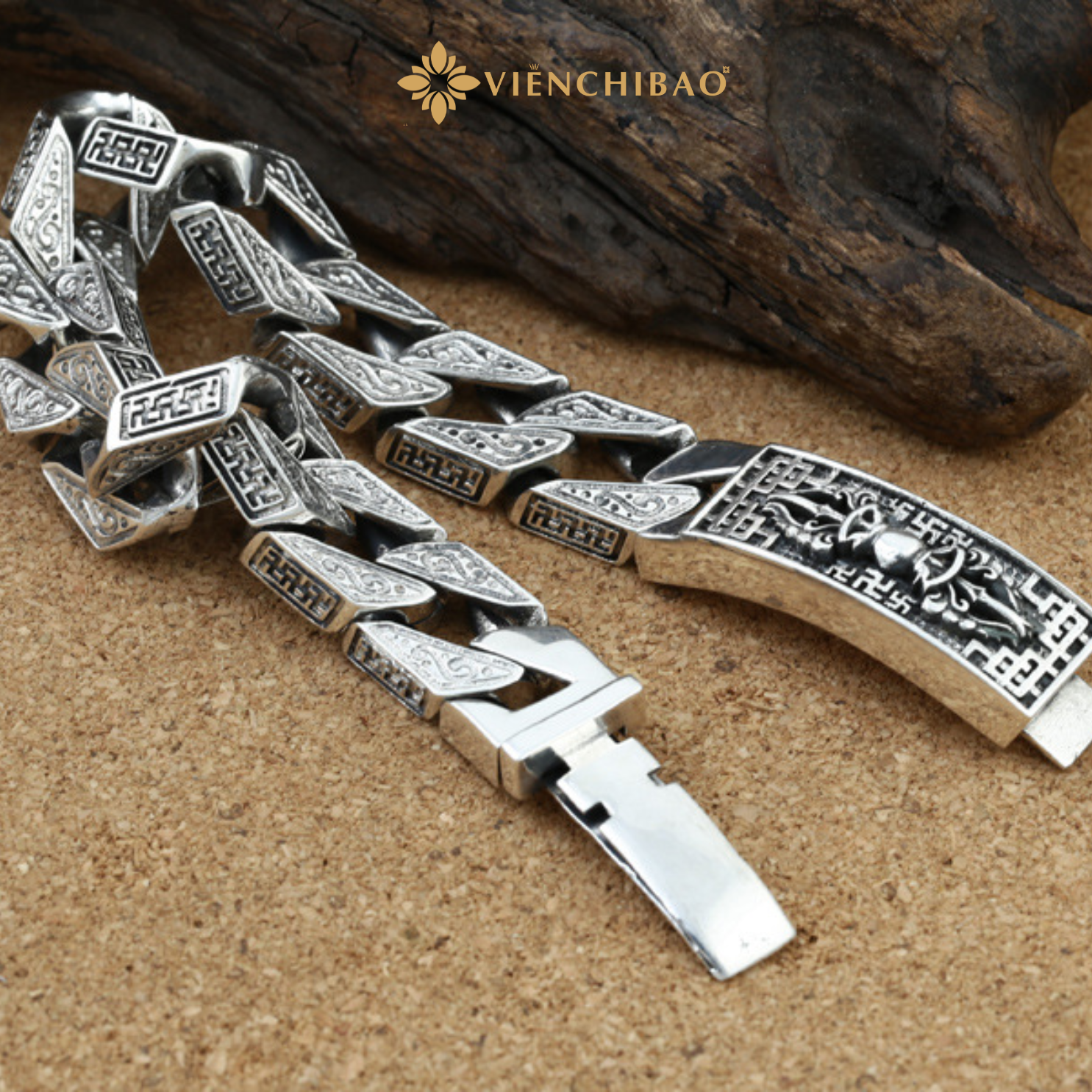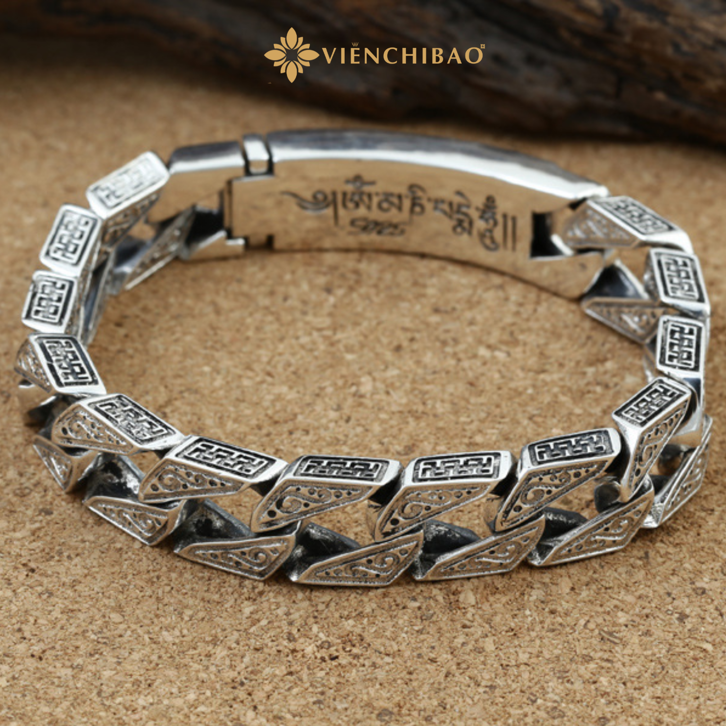 Sản phẩm sử dụng bạc Thái S925, được xử lý oxy hóa thủ công để tạo gam màu trầm đen xen bạc sáng – tạo hiệu ứng đối lập sắc nét và tăng độ nổi bật cho chi tiết khắc. Lắc tay có bản dày, cấu trúc mắt xích hình tam giác nối tiếp nhau, thể hiện sức mạnh vững chắc. Trên mặt lắc, hình tượng Chùy Kim Cang được khắc nổi lớn, chi tiết rõ nét; quanh đó là biểu tượng Chữ Vạn và thần chú Om Mani Padme Hum khắc chìm ở mặt trong. Kích thước nổi bật: 13 mm độ rộng, trọng lượng ~71 g – khẳng định sự đầm tay, chắc chắn và dành cho người yêu phong cách mạnh mẽ.