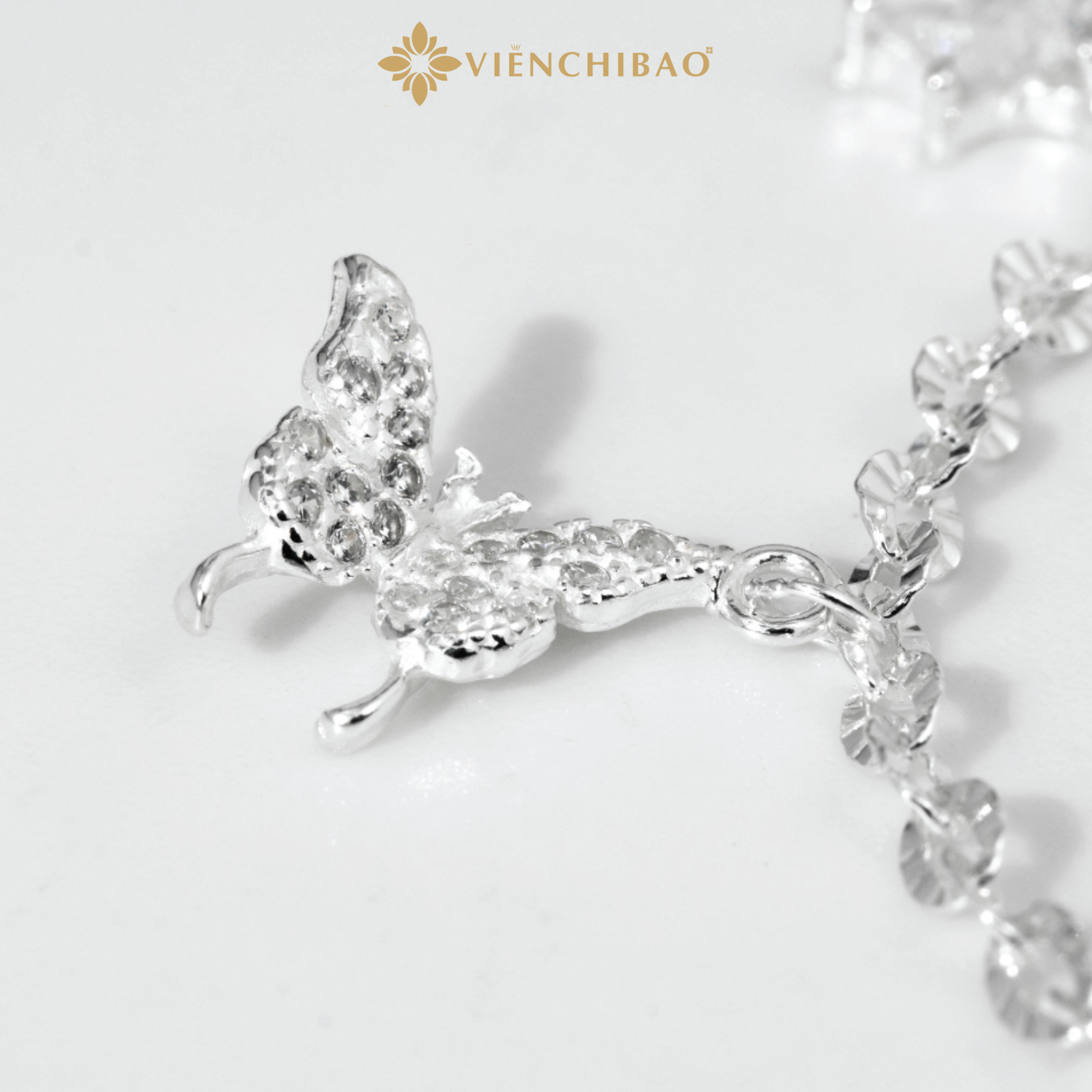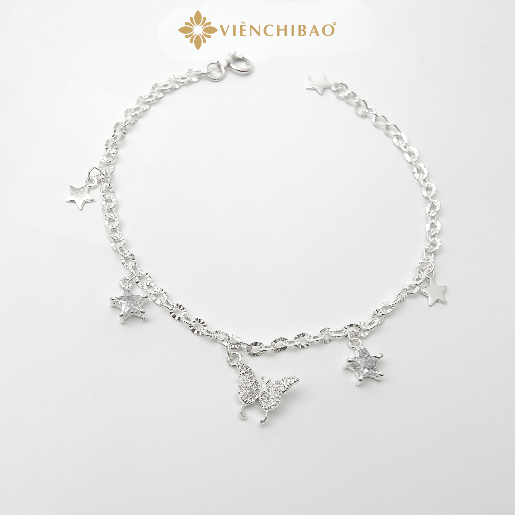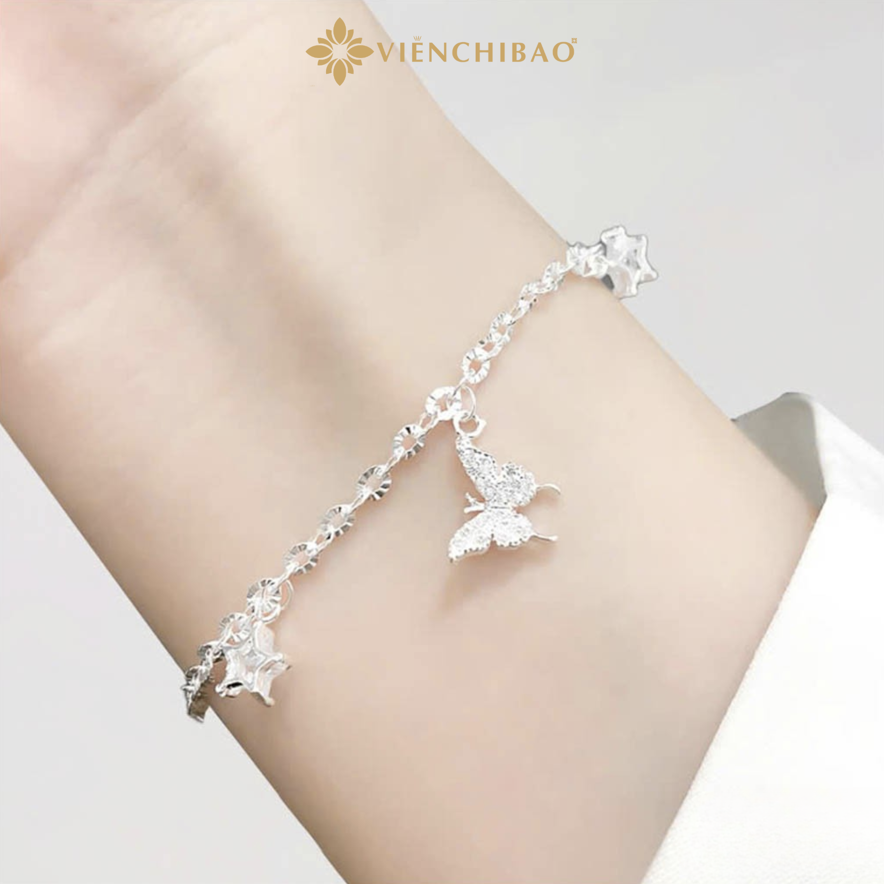Hoa văn / chi tiết đặc trưng: Charm cánh bướm với đường nét mềm mại, kết hợp cùng charm ngôi sao nhỏ tinh tế — có thể đính đá li ti để tăng độ lấp lánh. Bề mặt bạc xử lý bóng nhẹ hoặc mờ tùy chi tiết để làm nổi bật hình khối. Các chi tiết mép lá, cạnh ngôi sao được mài mềm để không gây cấn khi đeo.