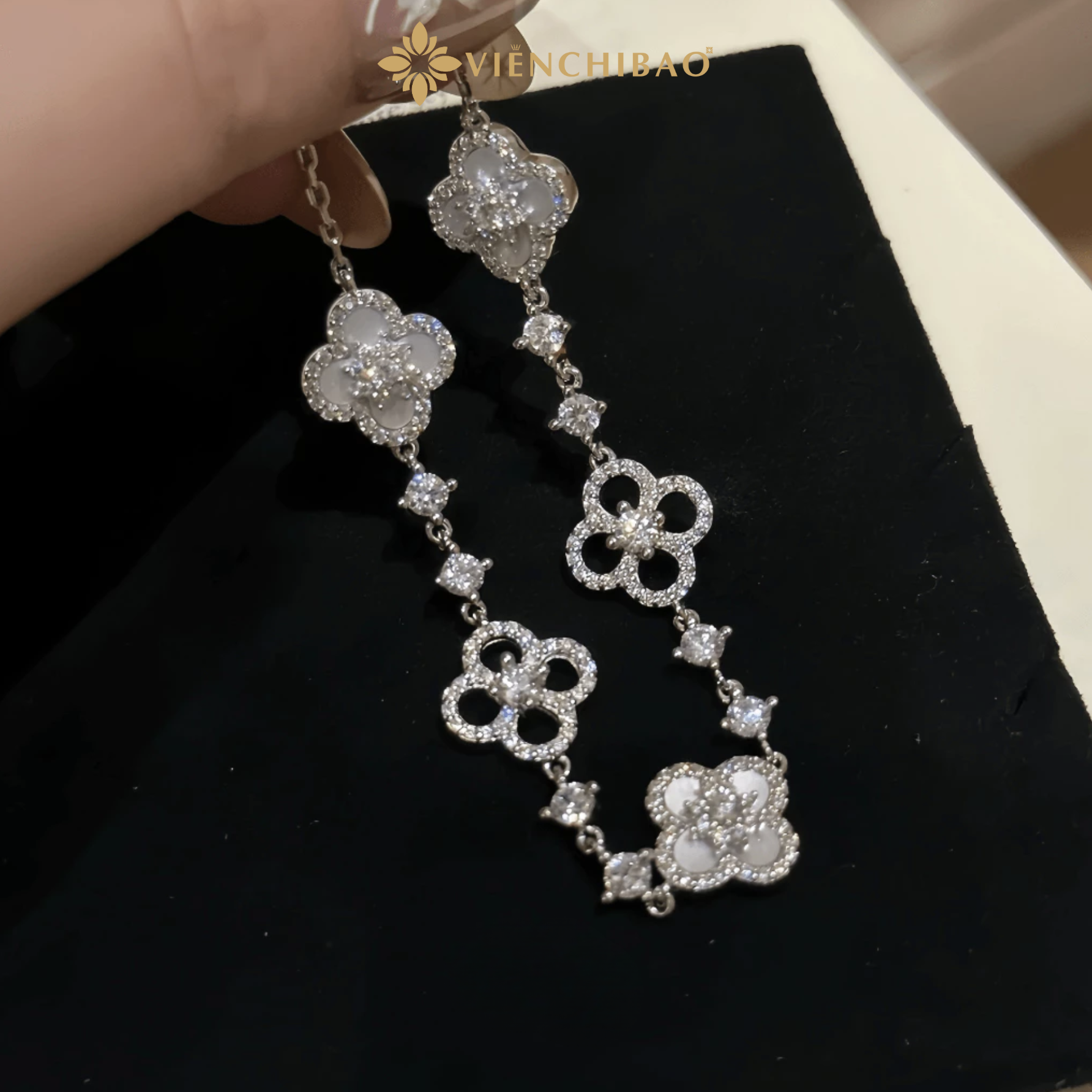 • Hoa văn / chi tiết đặc trưng: Charm hình cỏ 4 lá với các lá cỏ được đính đá nhỏ — tạo điểm nhấn sáng. Bề mặt bạc xử lý mịn hoặc hơi bóng nhẹ để làm nổi bật đá. Các cạnh lá cỏ được bo tròn, đường viền tinh tế để không gây cào da.