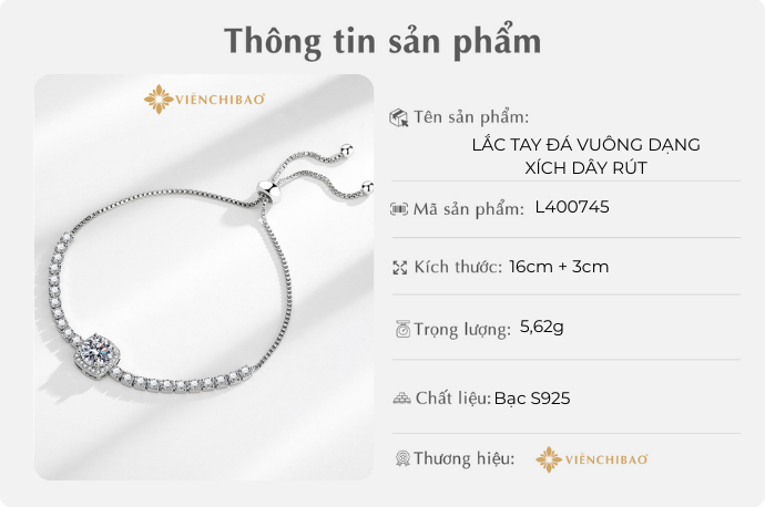 I. THÔNG TIN SẢN PHẨM LẮC TAY ĐÁ VUÔNG DẠNG XÍCH DÂY RÚT – BẠC Ý S925