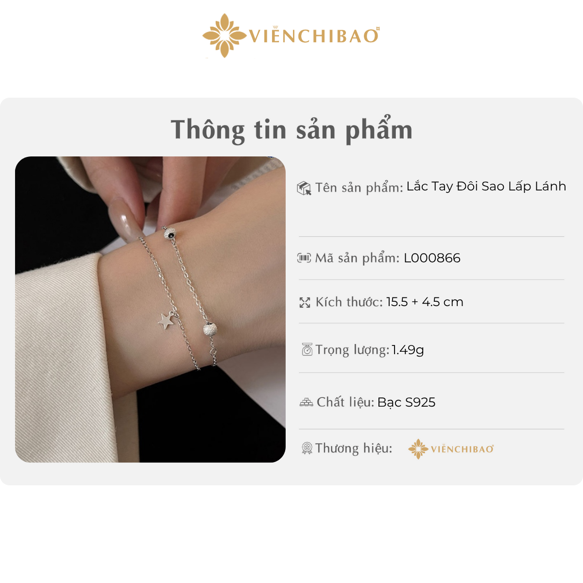 Sản phẩm Lắc Tay Đôi Sao Lấp Lánh được chế tác từ bạc S925 cao cấp, đảm bảo độ sáng bóng và bền màu. Khi mua tại Viễn Chí Bảo, bạn sẽ nhận được: