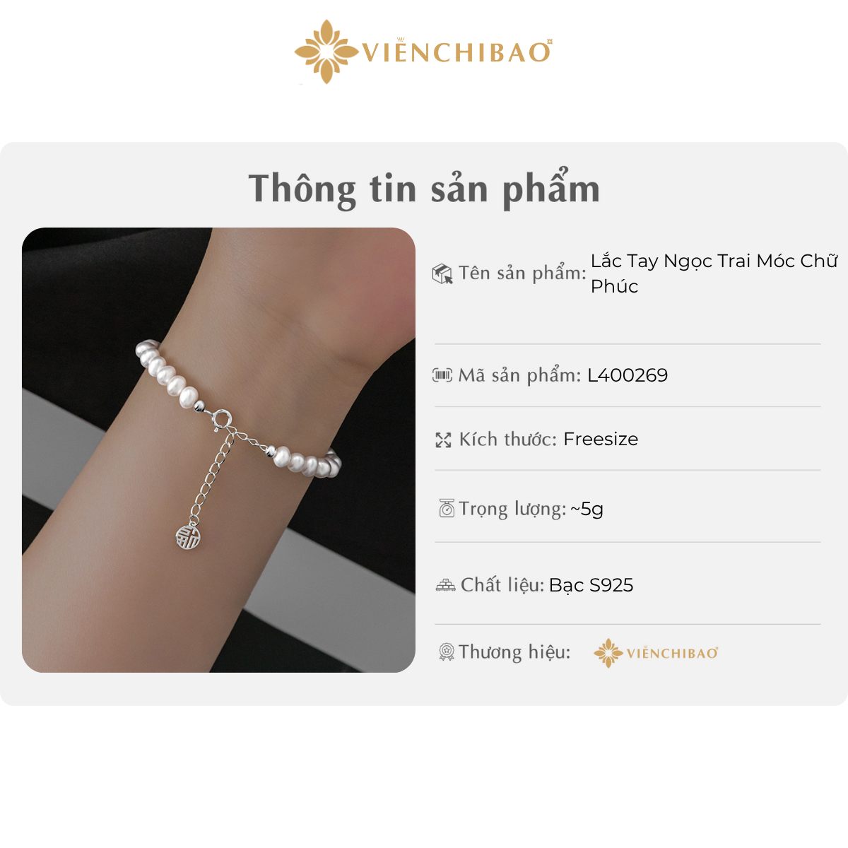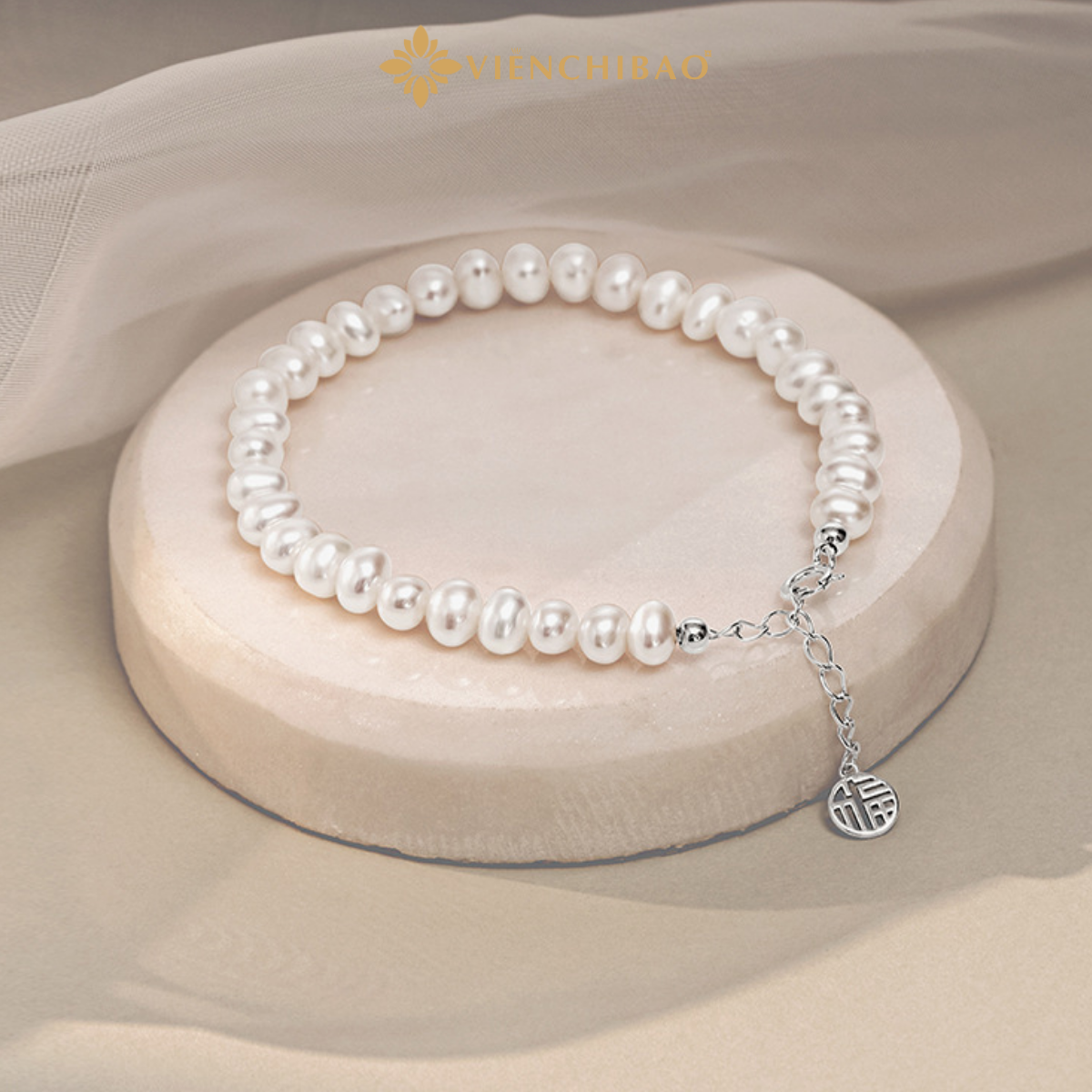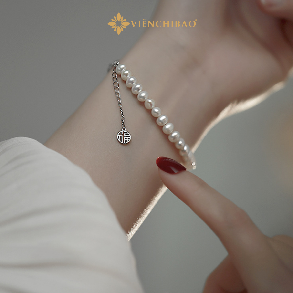 Khi đeo trên tay, những hạt ngọc trai nhỏ xếp đều nhau, phản chiếu ánh sáng mềm mại, khiến làn da trở nên sáng và thanh thoát hơn. Đặc biệt, điểm nhấn là móc bạc khắc chữ “Phúc”, mang hàm ý thu hút tài lộc, bình an và hạnh phúc viên mãn – đúng như cái tên “Phúc” đầy may mắn của người Việt.