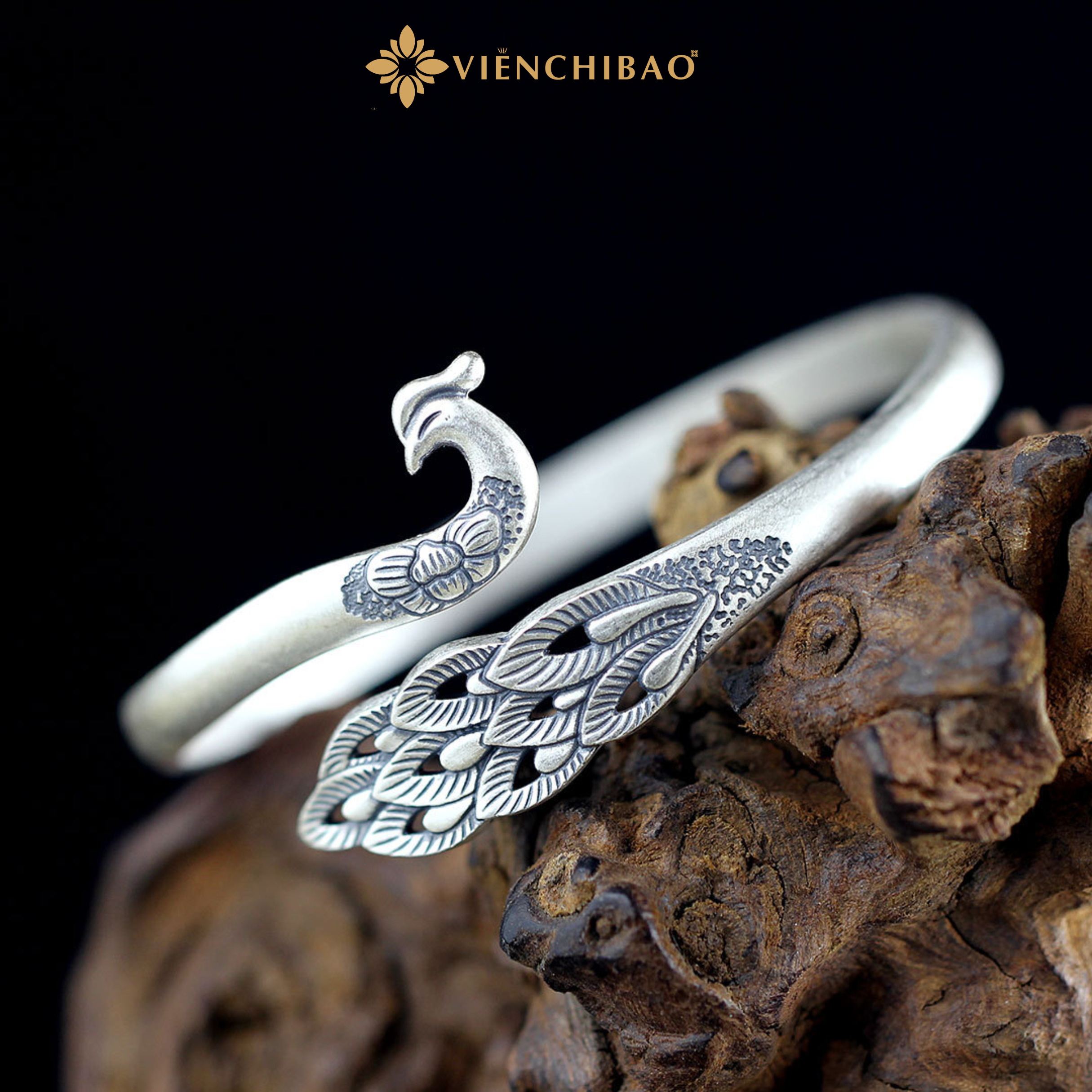Vòng tay Khổng Tước Vạn Phúc với hàm lượng bạc 99%, có độ tinh khiết bạc cao. Vòng tay bạc Thái được chế tác dày dặn, nét chạm khắc tinh tế, sống động, bề mặt được đánh bóng mờ không trầy xước. Nhờ công nghệ oxy hóa cao cấp, vòng tay Khổng Tước Vạn Phúc mang màu đen nâu đặc trưng của bạc Thái cao cấp.