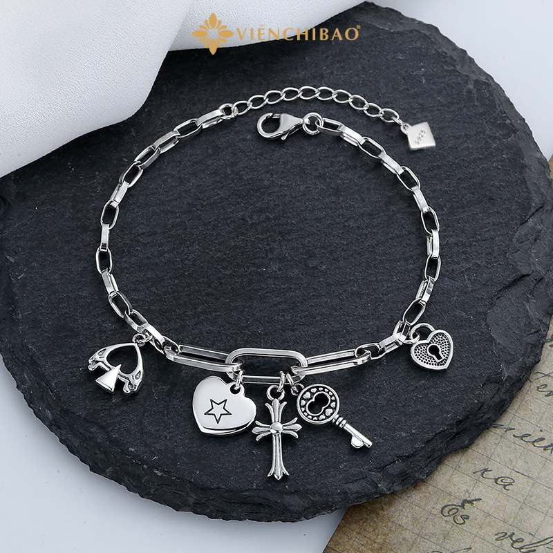 • Kiểu dáng: Dây bạc dạng mắt xích bản vuông dày dặn, đính kèm 5 charm nhỏ gồm: thánh giá, chìa khóa, trái tim, ngôi sao và biểu tượng Chrome Heart – tạo nên sự cân đối và điểm nhấn độc đáo.
