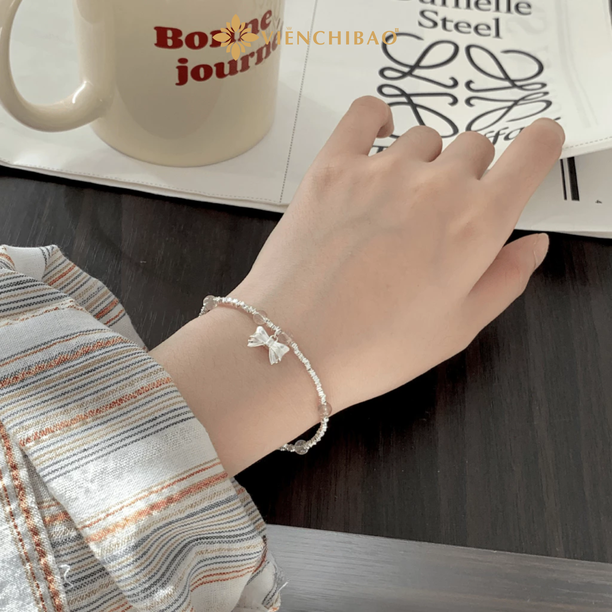 Điểm nhấn trung tâm là chiếc mặt nơ nhỏ nhắn được đánh bóng kỹ lưỡng, mang đến vẻ đẹp vừa đáng yêu vừa tinh tế. Thiết kế chuỗi hạt dạng vòng tròn mềm mại, có phần nối và khóa điều chỉnh độ dài, phù hợp với nhiều kích cỡ cổ tay. Nhờ đó, người đeo vừa cảm thấy thoải mái vừa có thể tự tin phối hợp cùng nhiều loại trang phục khác nhau – từ phong cách ngọt ngào, dễ thương đến thanh lịch, hiện đại.