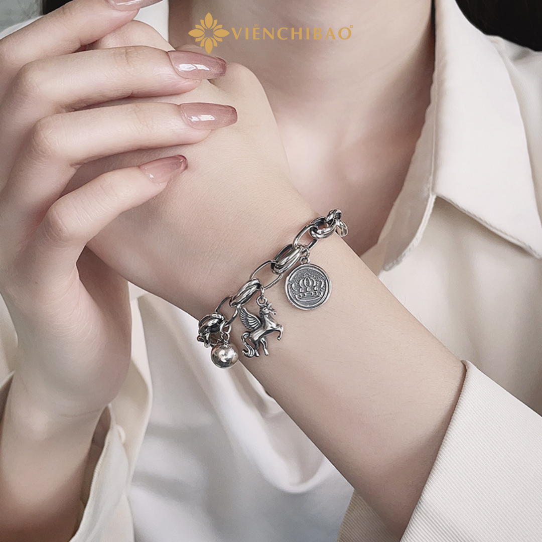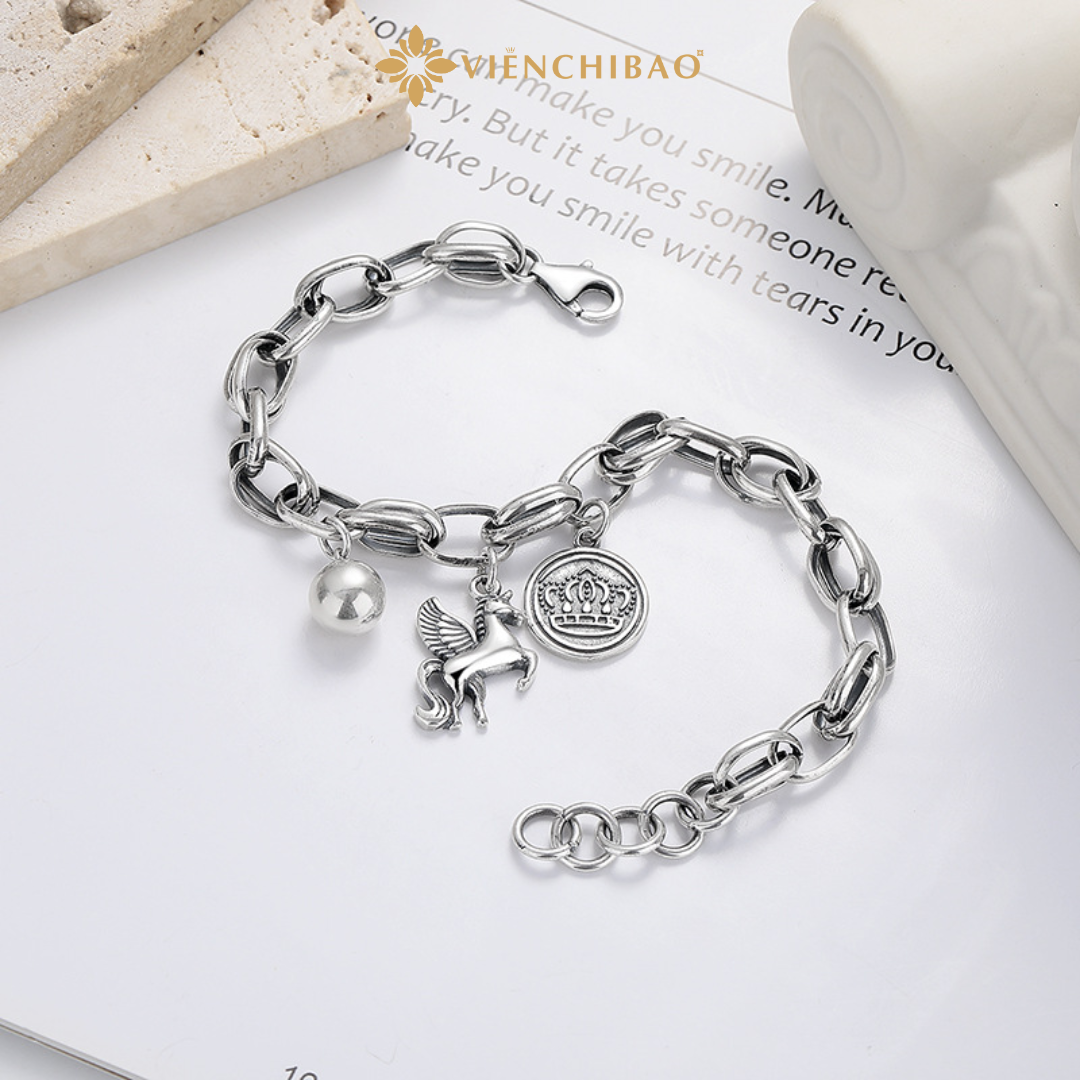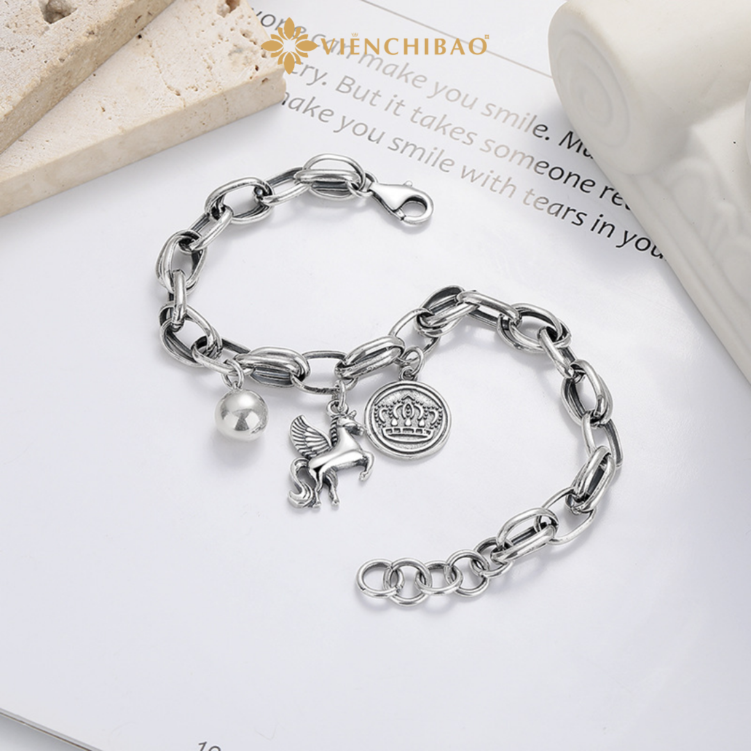 Kiểu dáng: Lắc tay dạng chuỗi bạc đan chắc chắn, điểm nhấn là charm Kỳ Lân đội vương miện được chạm khắc tỉ mỉ, tạo điểm nhấn ấn tượng và sang trọng.