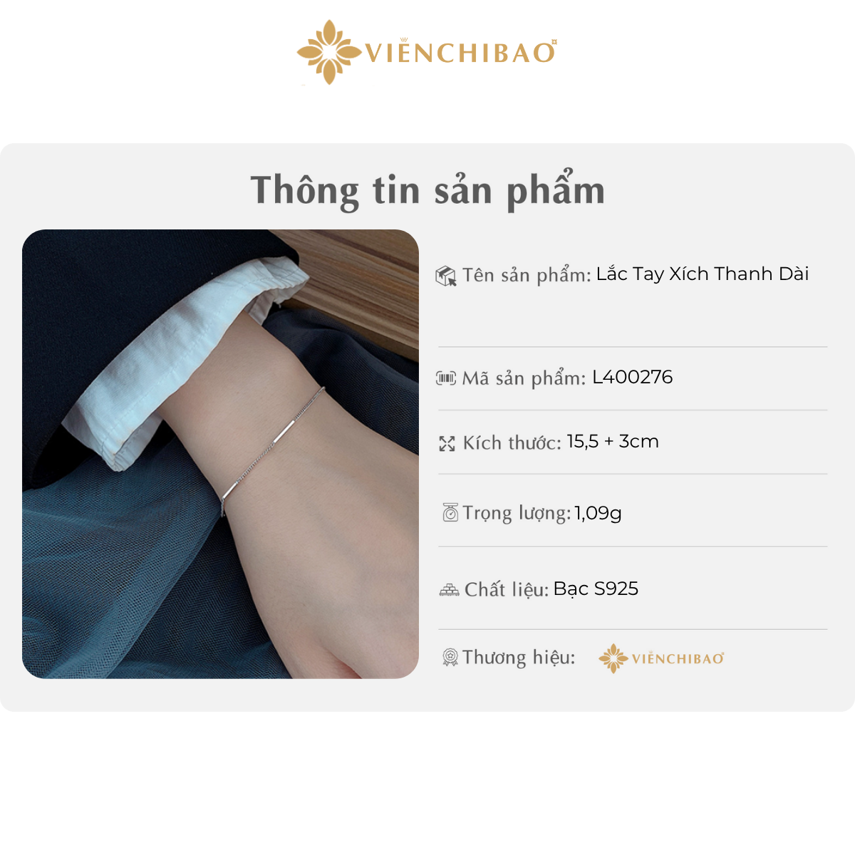 Viễn Chí Bảo xin gửi lời cảm ơn chân thành đến Quý khách đã quan tâm đến sản phẩm lắc tay xích thanh dài – bạc S925. Chúng tôi tin rằng, mỗi thiết kế không chỉ là món trang sức, mà còn là một biểu tượng của phong cách và cảm xúc – nơi hội tụ tinh hoa chế tác bạc thủ công cùng tinh thần thời trang đương đại.