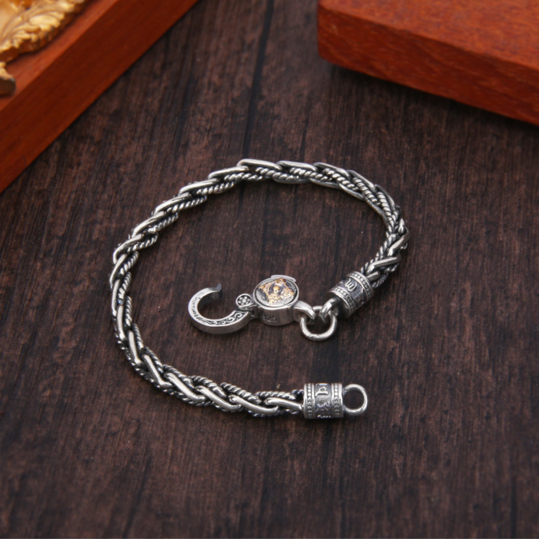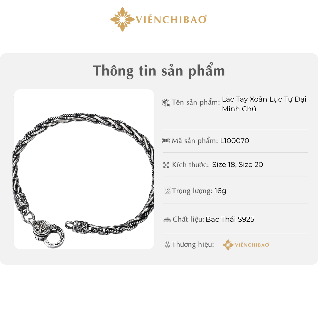 Kiểu dáng: Lắc tay dạng dây xoắn, từng sợi bạc đan xen tinh tế, kết hợp cùng khóa tròn khắc họa Lục Tự Đại Minh Chú.