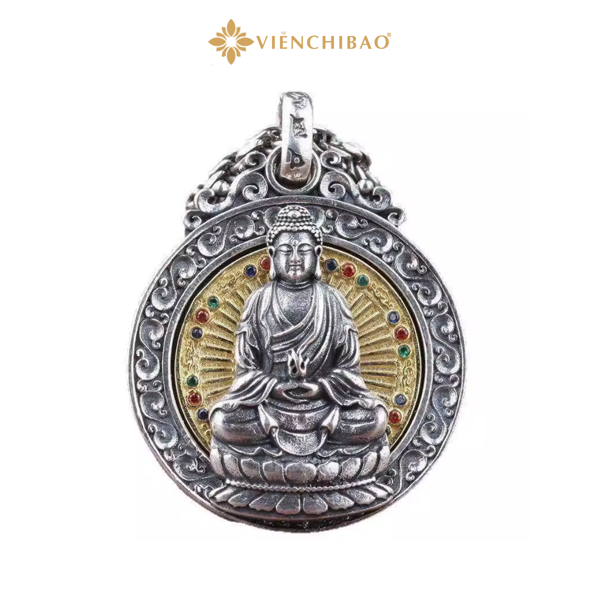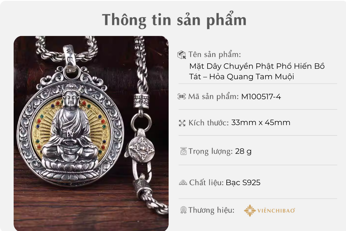 Mặt dây chuyền Phật Phổ Hiền Bồ Tát – Hỏa Quang Tam Muội được chế tác từ bạc S925 cao cấp, kết hợp mạ vàng tinh xảo, nổi bật với hình tượng Phổ Hiền Bồ Tát an tọa trên lưng voi trắng – biểu tượng của trí tuệ và đại hạnh. Bao quanh là hào quang rực rỡ, được gọi là Hỏa Quang Tam Muội, tượng trưng cho sự khai sáng, diệt trừ vô minh và dẫn dắt con người đến con đường giác ngộ.