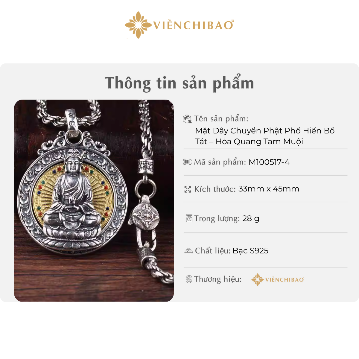 Cảm ơn Quý khách đã quan tâm đến Mặt Dây Chuyền Phật Phổ Hiền Bồ Tát – Hỏa Quang Tam Muội tại Viễn Chí Bảo. Chúc Quý khách luôn bình an, trí tuệ khai sáng và thành công viên mãn.